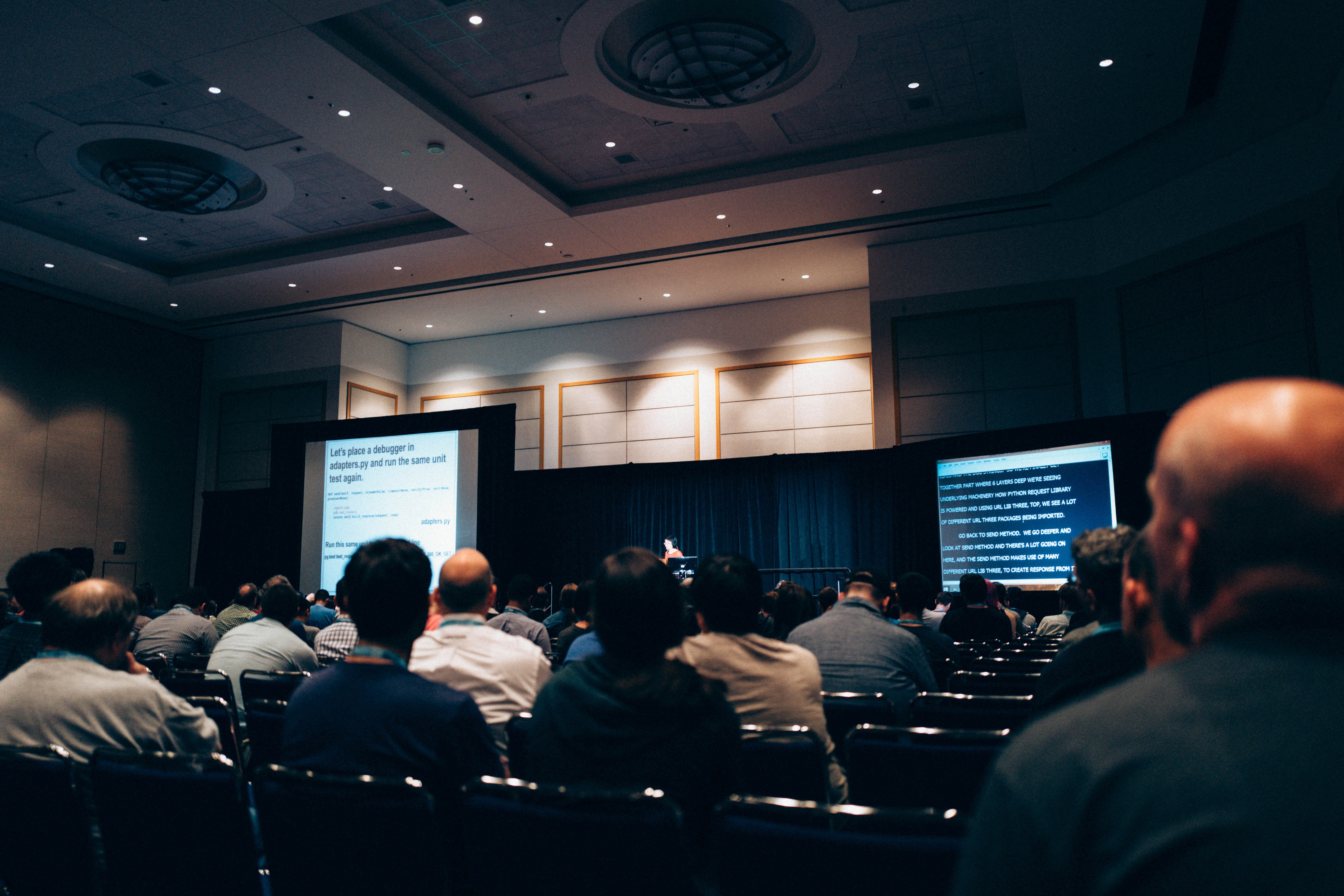 In a dimly lit conference room, an audience is intently focused on a speaker at the front, capturing a moment of collective engagement. The soft glow of presentation screens illuminates the faces, highlighting curiosity and interest among the attendees. The composition emphasizes the depth of the room, drawing the viewer's eye towards the speaker, creating a mood of anticipation and learning.