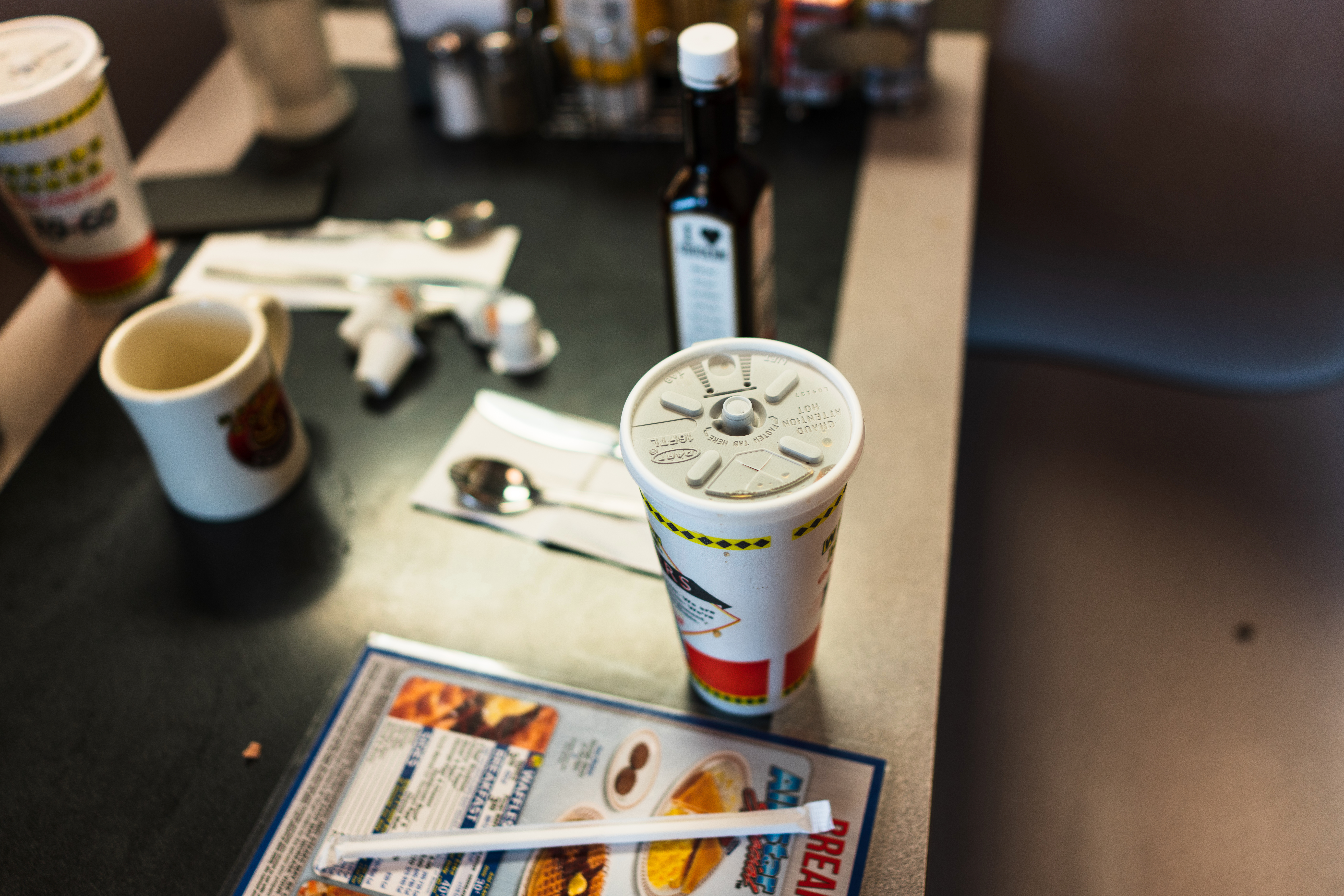 This photograph captures a casual diner scene, focusing on a colorful cup sitting atop a table cluttered with utensils and condiments. The warm, natural light softly illuminates the space, evoking a sense of comfort and nostalgia. The vibrant colors of the cup and the organized chaos of the setting create an inviting atmosphere, perfect for leisurely meals.