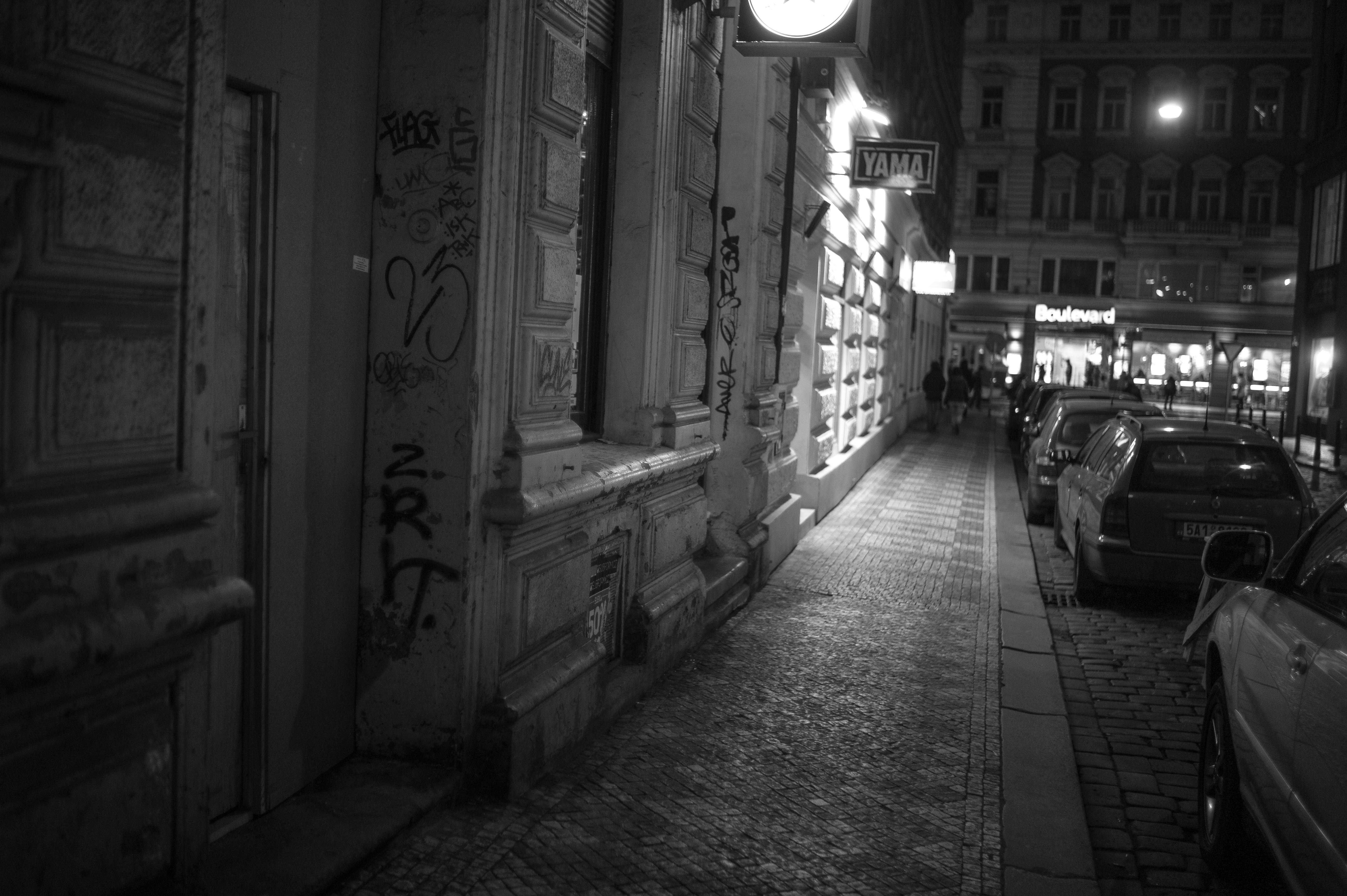 This black-and-white photograph captures a quiet street corner under the muted glow of city lights. The angle leads the viewer's eye along the cobblestone pathway, highlighting the interplay of shadows and graffiti-strewn walls, which evoke a sense of urban decay amidst the nightlife. Despite the bustling hints of humanity in the distance, the composition conveys a mood of solitude and introspection.