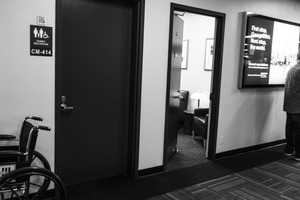 This black-and-white photograph captures a moment in a corridor marked by a family restroom sign and an open door revealing a cozy waiting area. The contrast of the dark doors and illuminated advertisement creates a sense of anticipation and quiet solitude, while a lone figure stands partially visible, deep in thought. The composition draws the eye toward the interplay of light and shadow, emphasizing themes of transition and pause in everyday life.