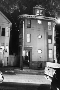 The photograph captures a quietly intriguing Victorian-style house at night, its whimsical architecture emphasized by soft, glowing windows. The stark black-and-white tones lend a moody, nostalgic feel, while the subtle streetlights cast delicate shadows that enhance the scene’s mysterious aura. A sense of solitude pervades, inviting the viewer to ponder the stories hidden within its walls.