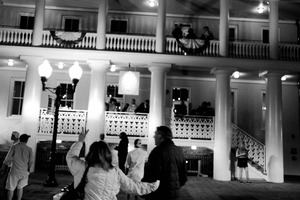 The photograph captures a lively night scene in black and white, with a group of people gathered outside a grand building adorned with festive decorations. Soft, warm lighting spills from the windows, illuminating the faces of attendees, while the white columns create a stately backdrop. The atmosphere is one of celebration and camaraderie, as figures gesture and interact in a moment of shared joy under the night sky.