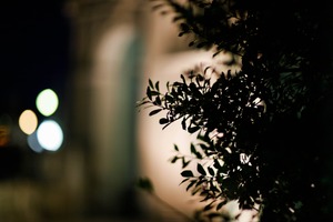 In this atmospheric photograph, a silhouetted plant leans into the frame, capturing the viewer's attention with its intricate leaf details. Soft bokeh lights in the background create a contrasting backdrop, evoking a mysterious and tranquil nighttime mood. The warm lighting highlights the shapes and textures, creating depth and inviting contemplation.