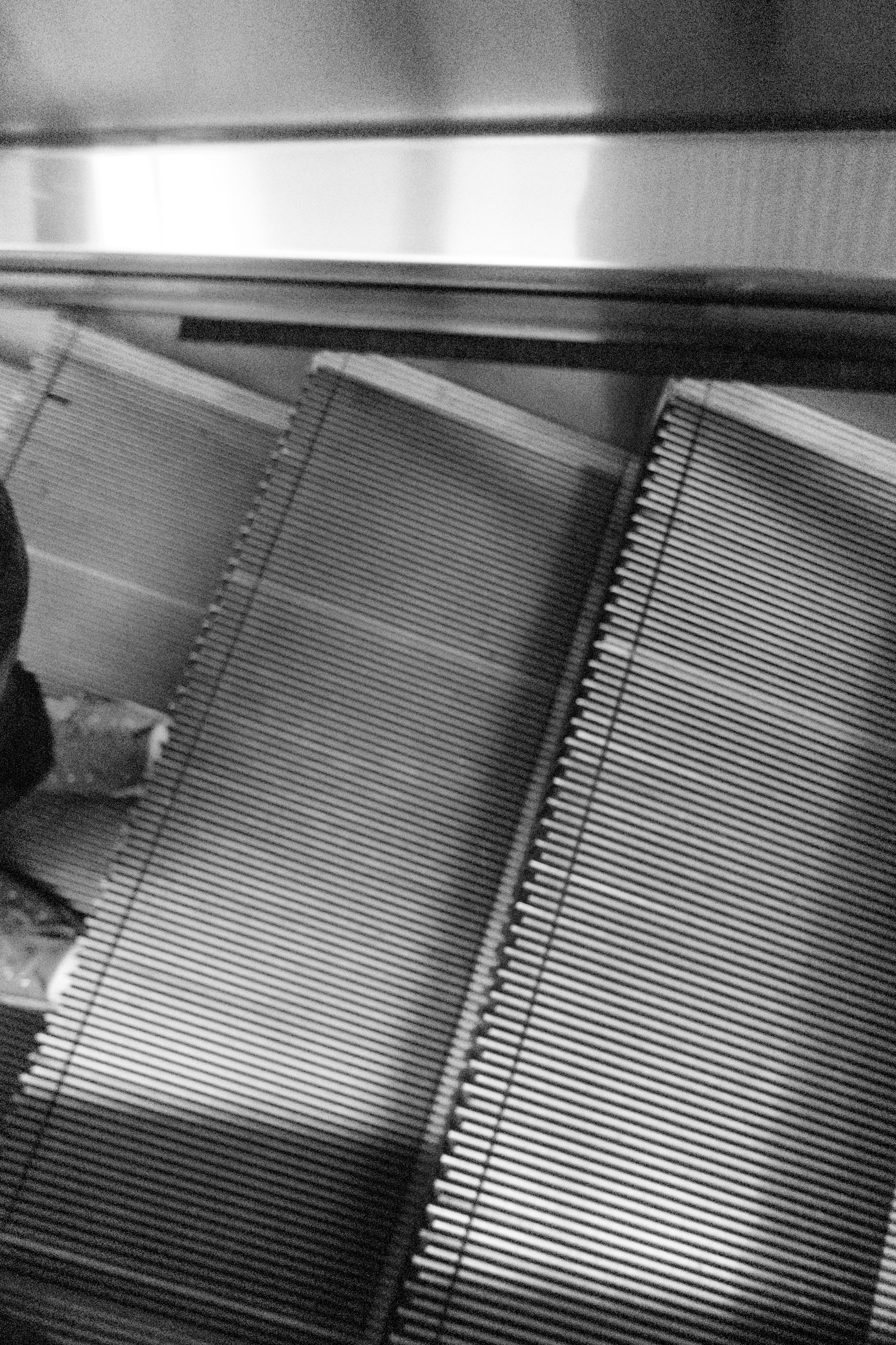This black-and-white photograph captures the view from above an escalator, with stark lines created by the metal gratings leading downward. A single pair of shoes emerges in the lower corner, suggesting the presence of an unseen traveler amid the mechanical setting. The interplay of light and shadow adds a moody, contemplative atmosphere to the scene, evoking a sense of transition and movement.