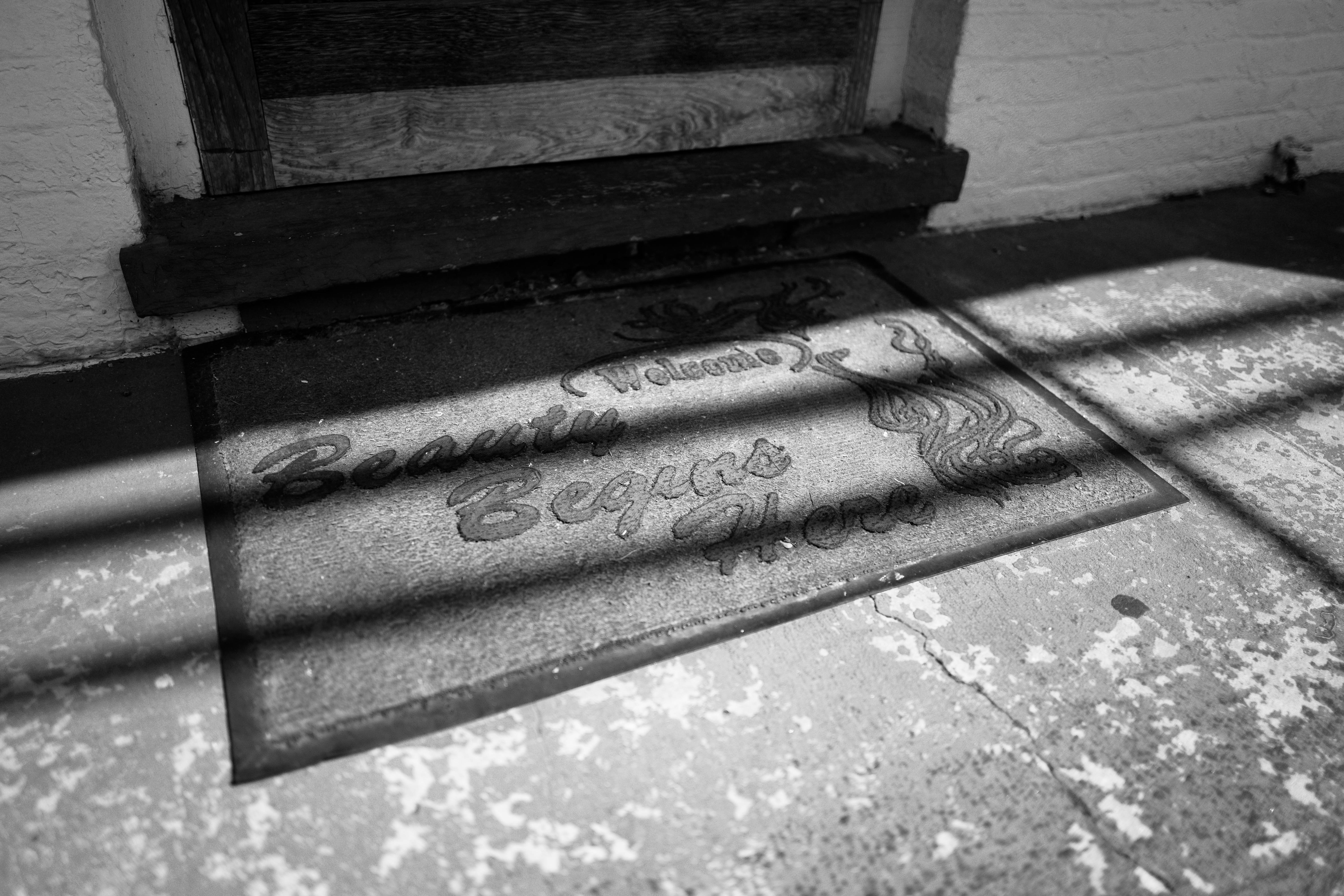 This black and white photograph features a textured doormat inscribed with the phrase '(Welcome) Beauty Begins Here,' setting a warm and inviting tone. The interplay of light and shadow creates a moody atmosphere, emphasizing the details of the mat and surrounding surfaces. The composition draws the eye towards the entrance, suggesting a threshold to something aesthetically pleasing just beyond the door.