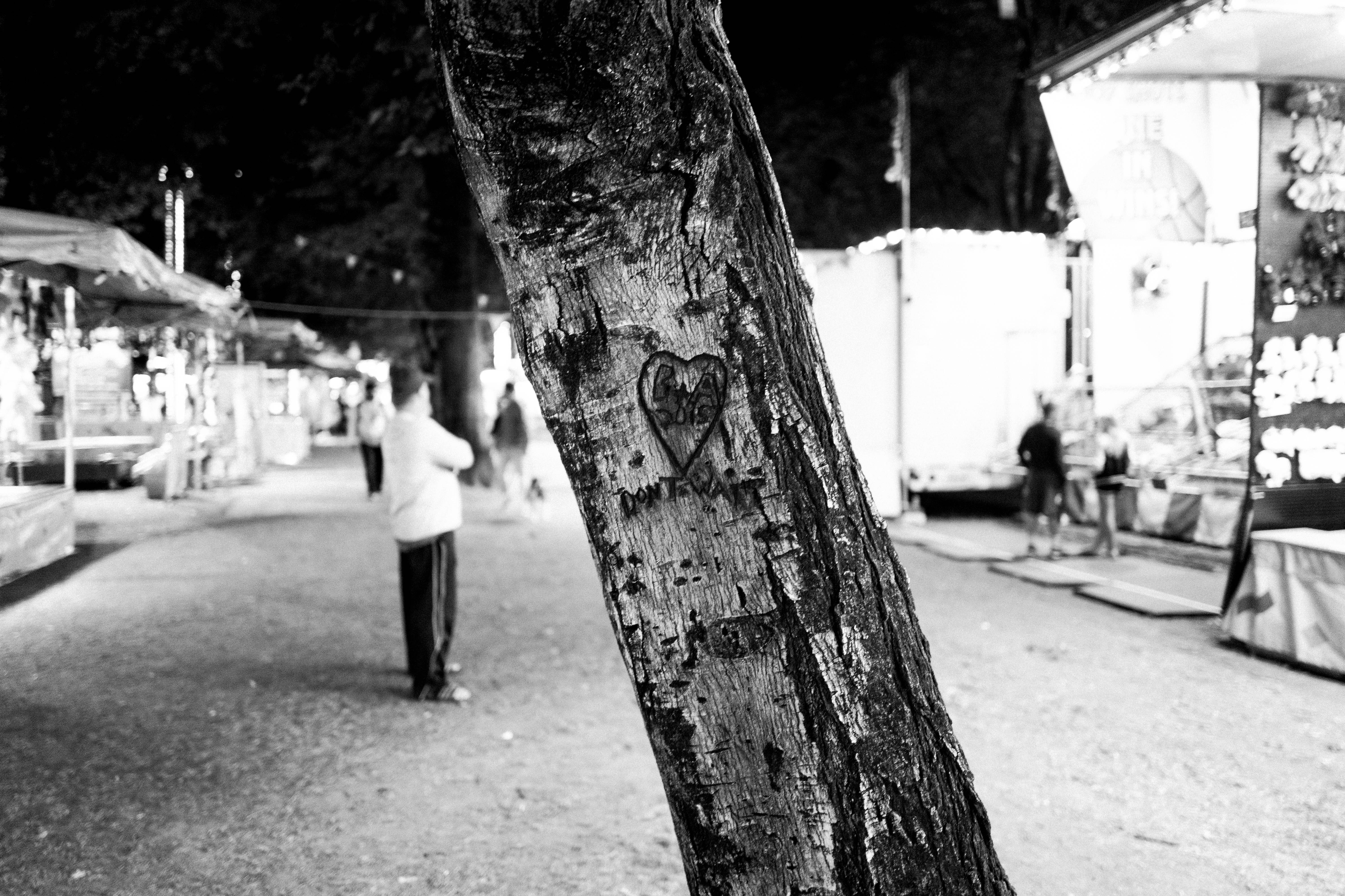 In a dimly lit fairground, a gnarled tree stands as a silent witness to fleeting moments of love, etched into its bark with a heart and the words 'Don't fade.' The blurred figures of visitors strolling by evoke a sense of nostalgia and longing, contrasting against the vibrancy of the event. The black and white palette enhances the mood, capturing the essence of fleeting memories in a whimsical atmosphere.