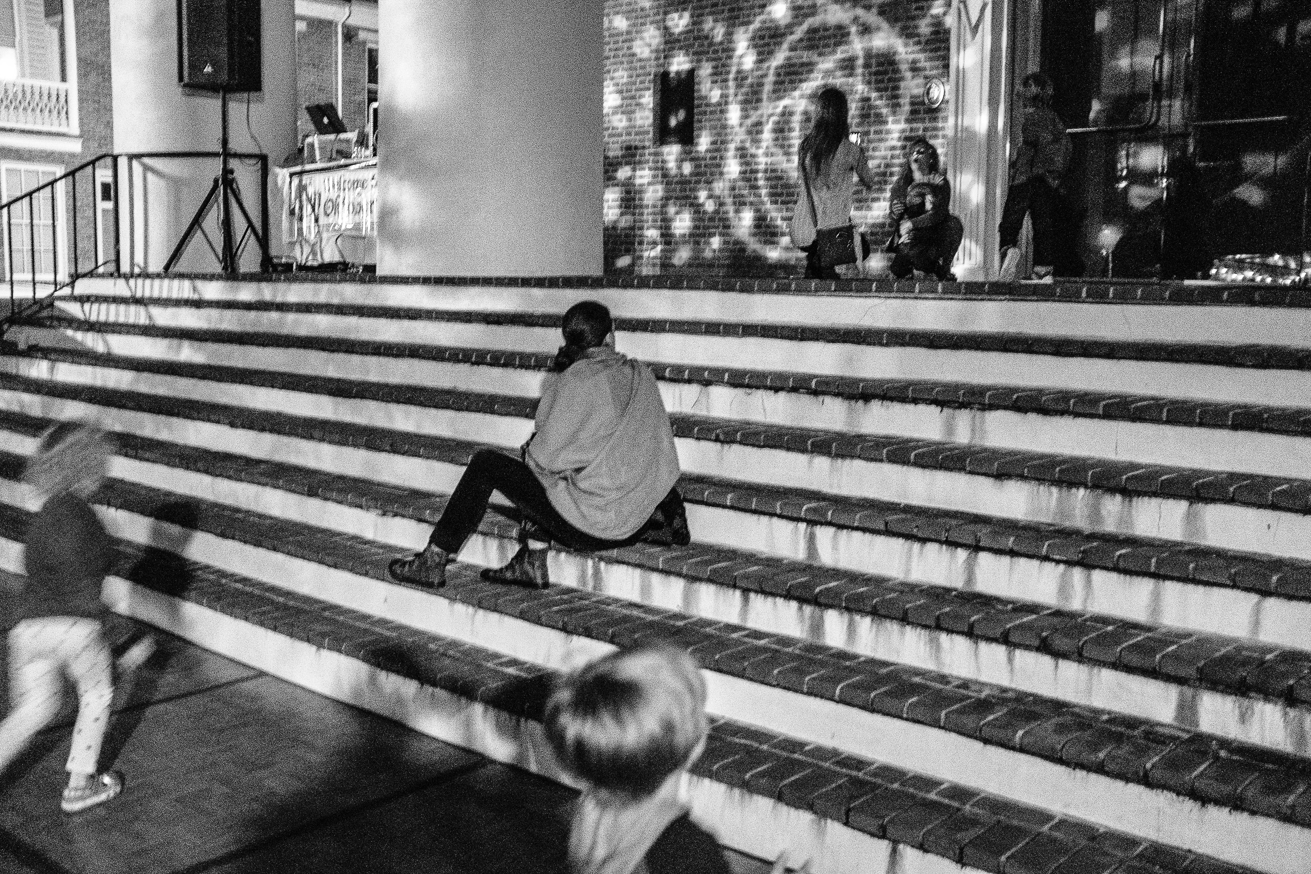 In the dimly lit scene, a lone figure sits contemplatively on the steps, their posture suggesting solitude amidst the surrounding activity. Children dart playfully in and out of the frame, their energy contrasting with the calm demeanor of the seated subject. The interplay of shadows and the soft glow of nearby lights creates a moody atmosphere, evoking a sense of introspection in a lively setting.