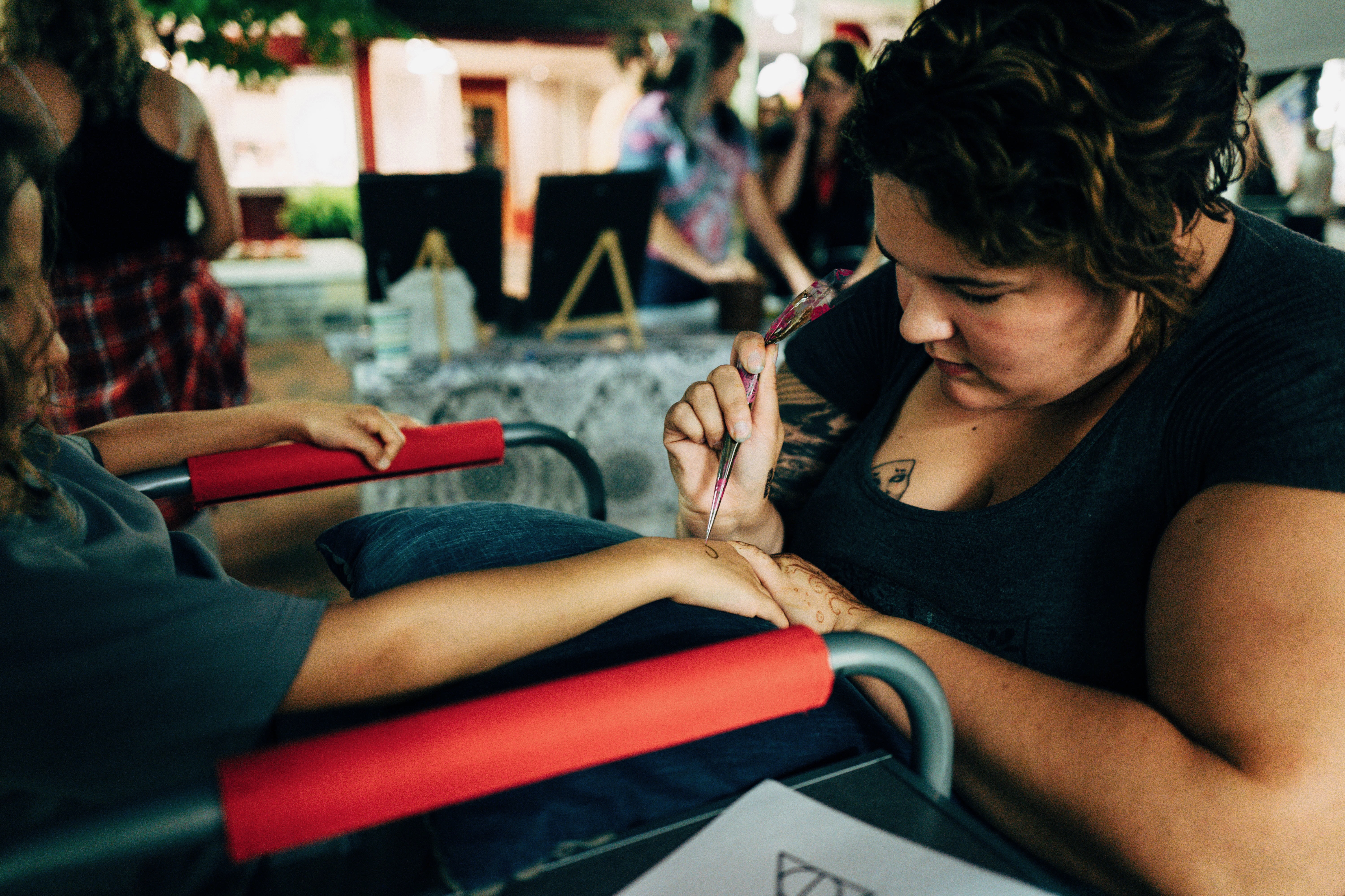 In a lively setting, a woman is delicately applying intricate henna designs to a young child's hand, showcasing a moment of creativity and connection. The warm, soft lighting envelops the scene, enhancing the intimate atmosphere, while blurred figures in the background suggest a bustling environment. The vivid colors of the artwork and the focused expressions evoke a sense of joy and artistry shared between the two.