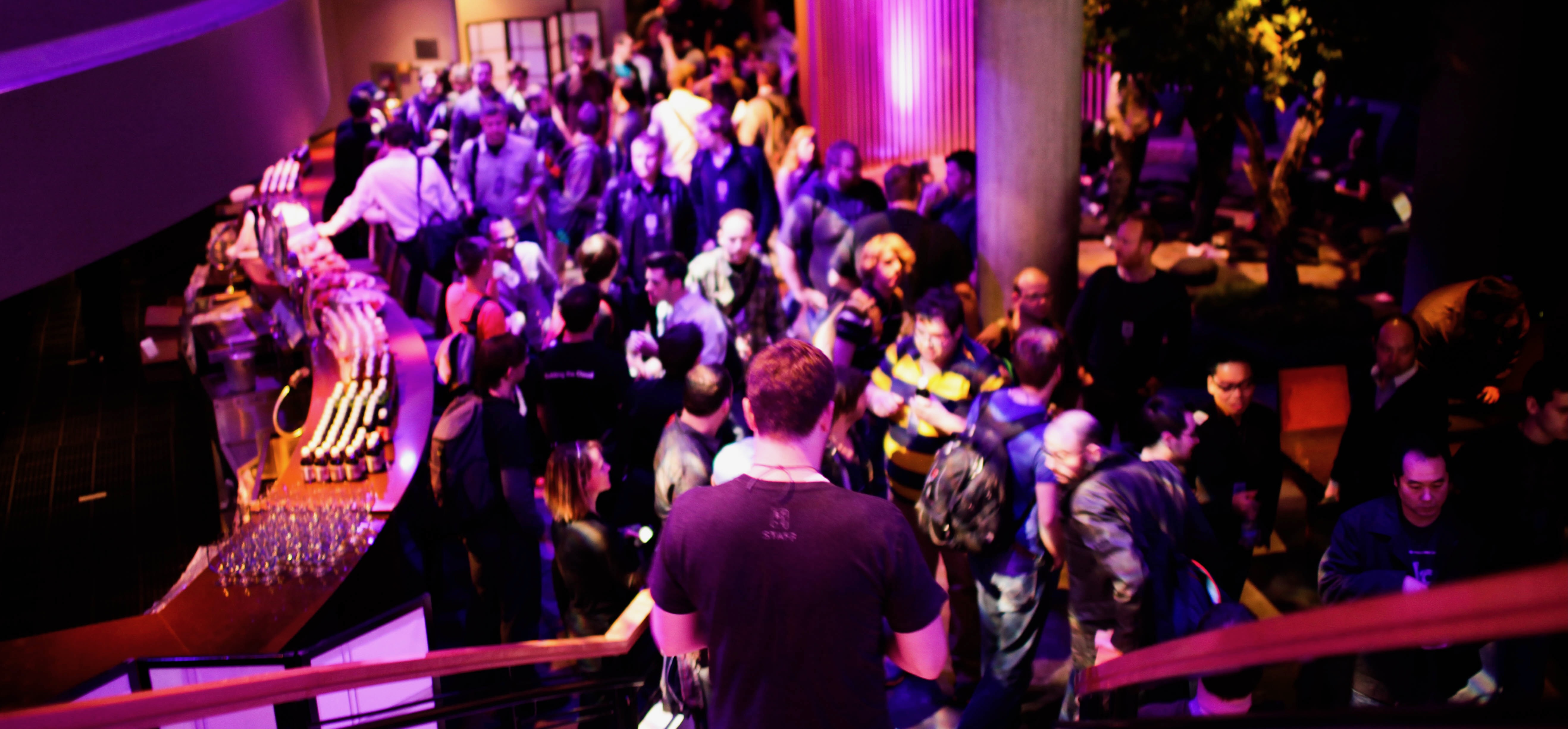 This photograph captures a lively gathering, with a blur of attendees mingling at a bustling bar area. The ambient purple lighting creates an energetic and vibrant mood, while the composition draws the viewer's eye toward the figures engaged in conversation, suggesting a sense of community and excitement. A figure stands in the foreground with their back turned, emphasizing the social atmosphere of the event beyond their perspective.