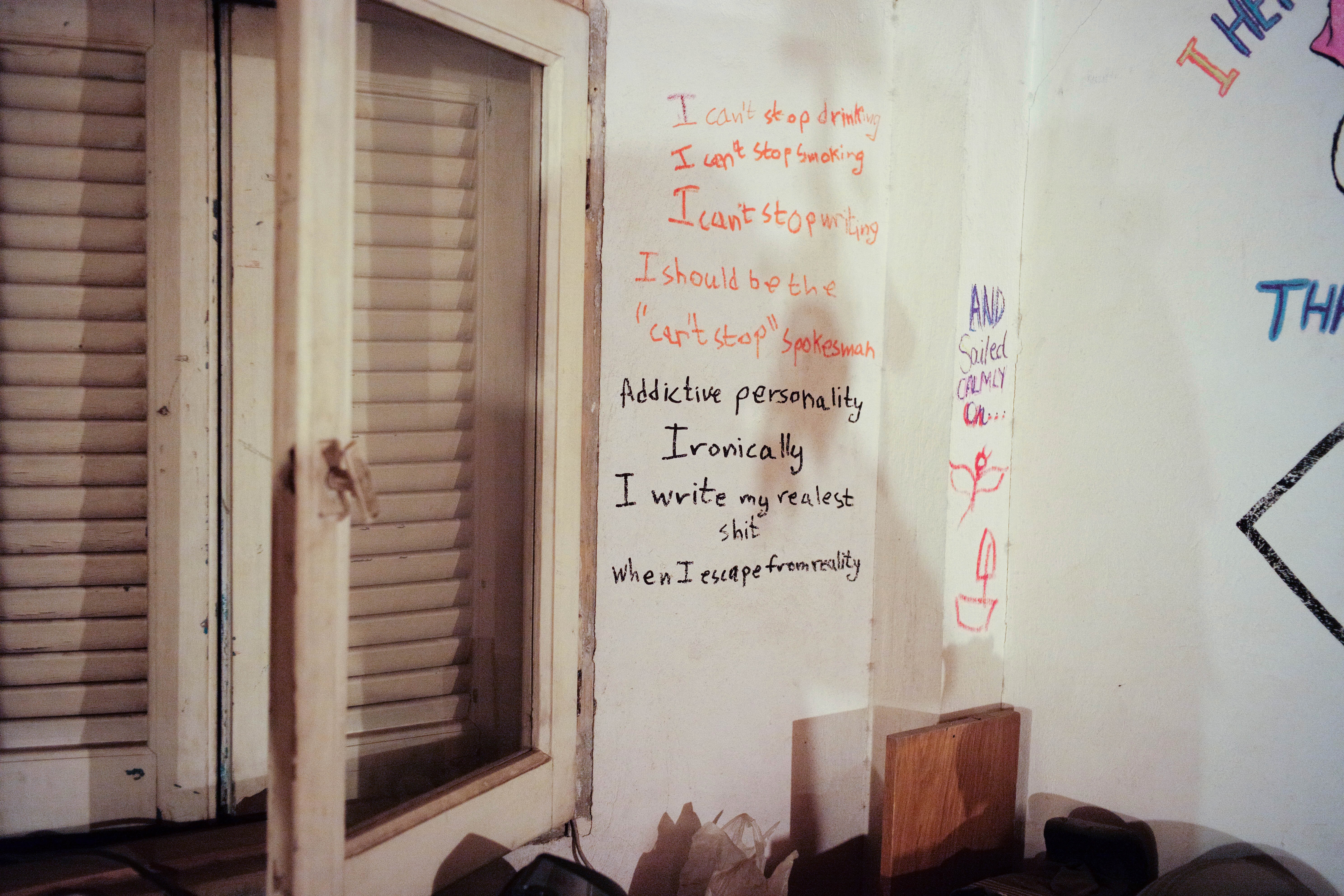 This photograph captures a dimly lit room with a window framing one side, where handwritten thoughts on a wall reveal a struggle with addiction and creativity. The juxtaposition of poignant confessions in vibrant colors against the stark white wall creates an intimate yet somber mood. The warm, low lighting adds depth, emphasizing the raw emotion behind the words, inviting reflection on the complexities of escapism and reality.