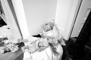 A discarded doll lies atop a pile of crumpled laundry, evoking a sense of nostalgia and abandonment. The monochromatic palette highlights the stark contrast between the doll's innocent expression and the chaotic surroundings. Soft, diffused light casts gentle shadows, enhancing the somber mood of the scene.
