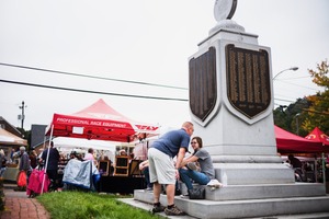 In a quaint market setting, a couple shares a tender moment beside an imposing monument etched with names of history. The ambient light casts a soft glow, enhancing the warm yet reflective mood, as vibrant red tents serve as a lively backdrop. The juxtaposition of personal connection and historical remembrance creates a poignant atmosphere of community and contemplation.
