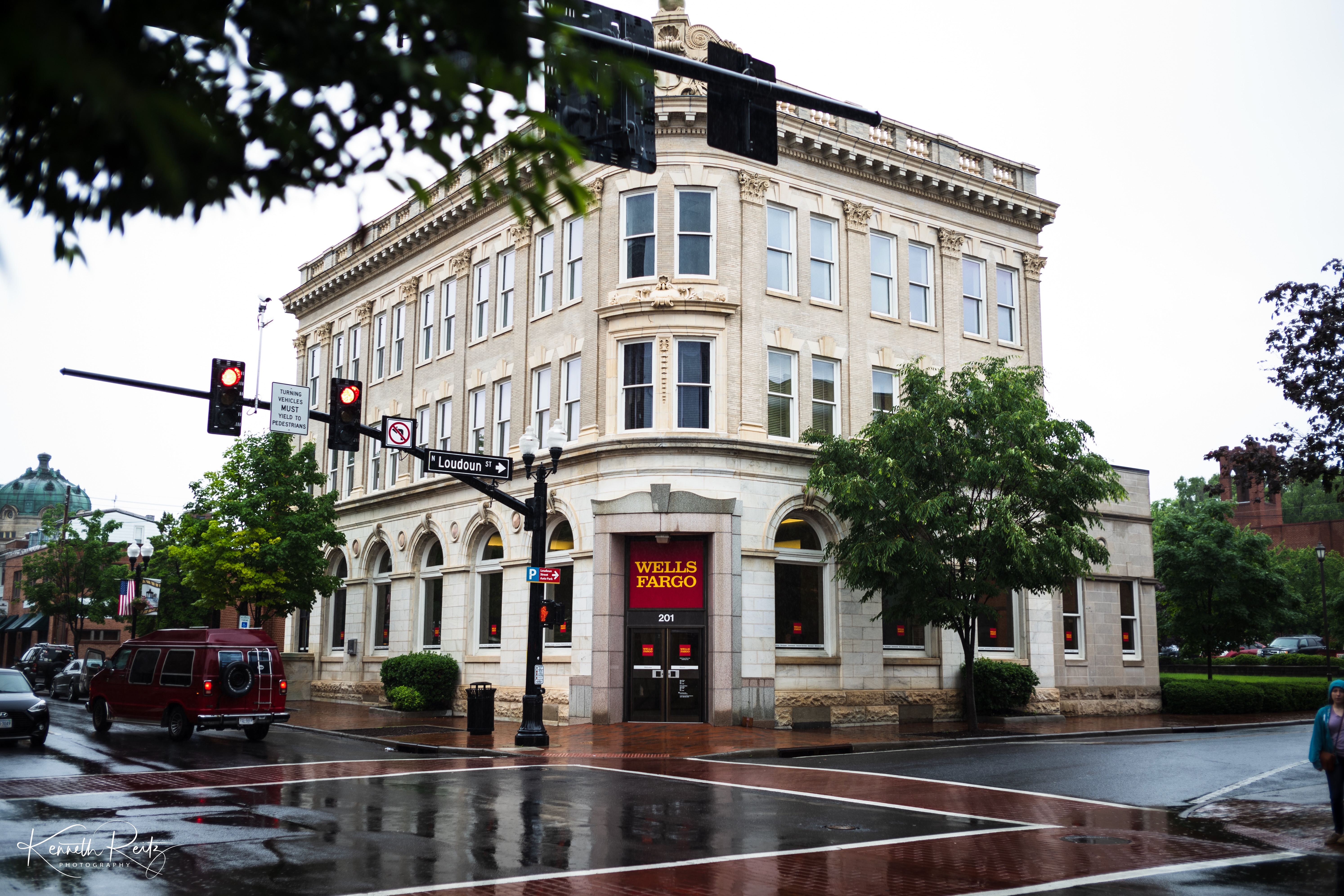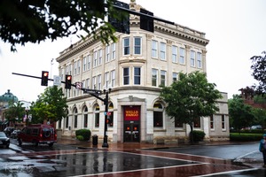 The photograph captures a Wells Fargo bank building, standing stately amidst a rain-soaked street. Soft reflections glisten on the pavement, while muted colors create a contemplative mood, emphasizing the serenity of the rainy atmosphere. Lush green trees frame the scene, contrasting elegantly against the architectural details of the building, inviting the viewer to pause in the moment.