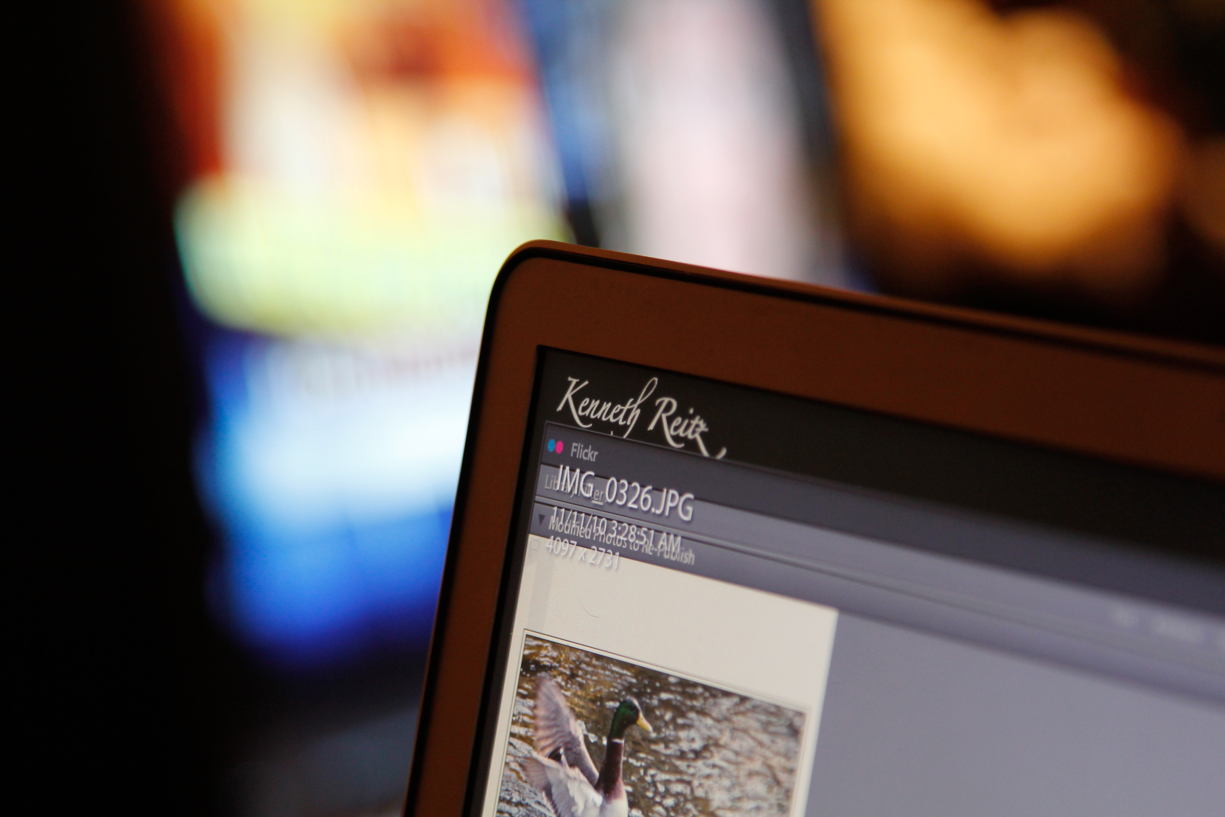 The photograph captures a close-up view of a laptop screen, where a wildlife image of a duck is displayed. The soft focus background adds a warm, inviting glow, contrasting with the sharp details on the screen, creating a sense of creativity and inspiration in a serene indoor setting.