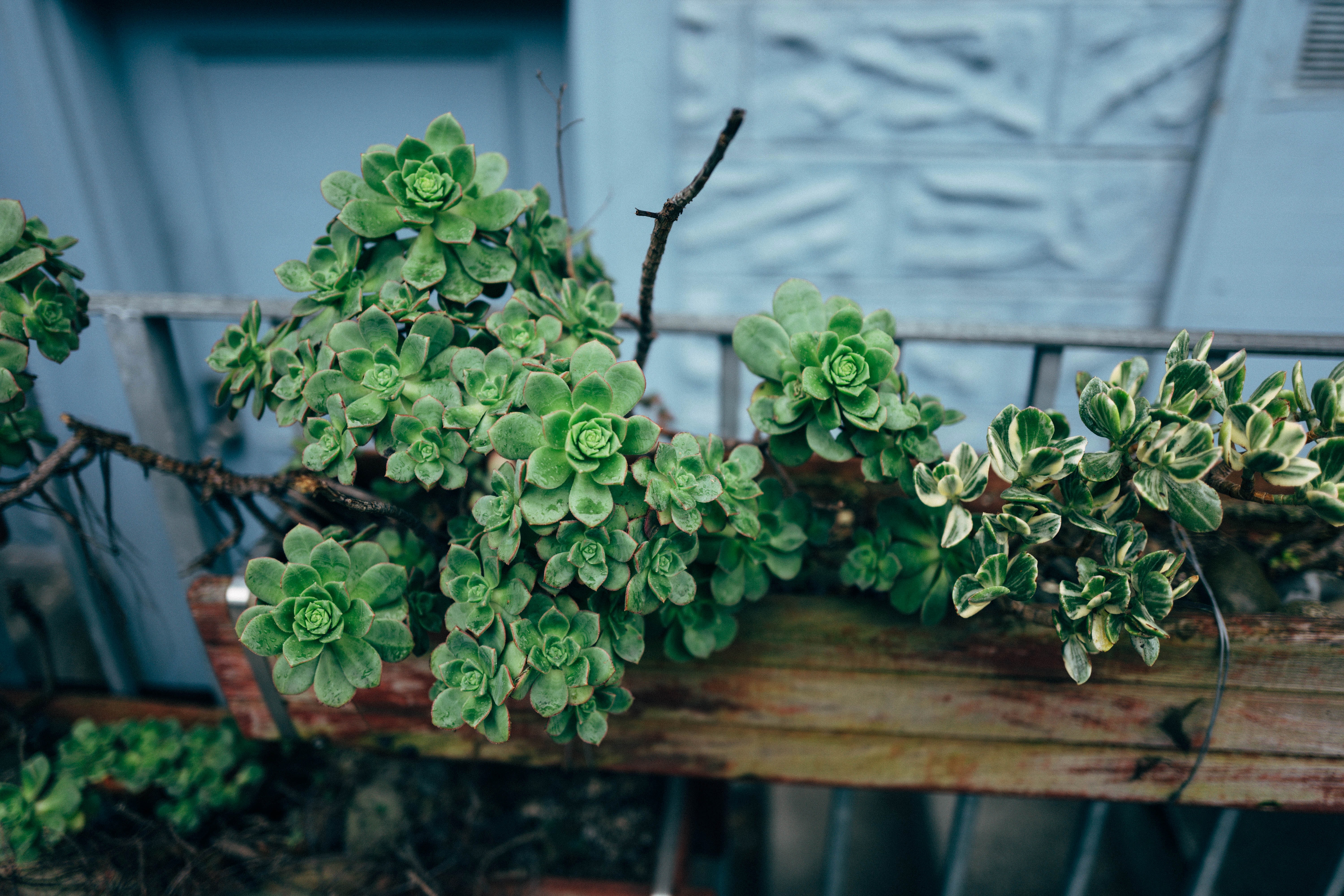 The photograph captures a vibrant display of green succulents sprawling over a rustic wooden planter, with a soft blue backdrop creating a serene ambiance. The composition emphasizes the intricate shapes and textures of the plants, while the cool lighting evokes a tranquil, calm mood. Subtle details, like the delicate twigs intermingling with the lush foliage, enhance the natural beauty, inviting viewers to connect with the simple elegance of nature.