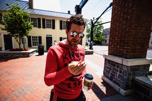 A man in a vibrant red hoodie, casually examining his phone, stands amidst a charming urban setting. The bright midday sun casts bold shadows, while reflections dance across his sunglasses, enhancing the relaxed yet focused mood of the scene. Surrounding architecture and greenery add a refreshing contrast to the modernity of his pose, creating a dynamic blend of styles and ambiance.