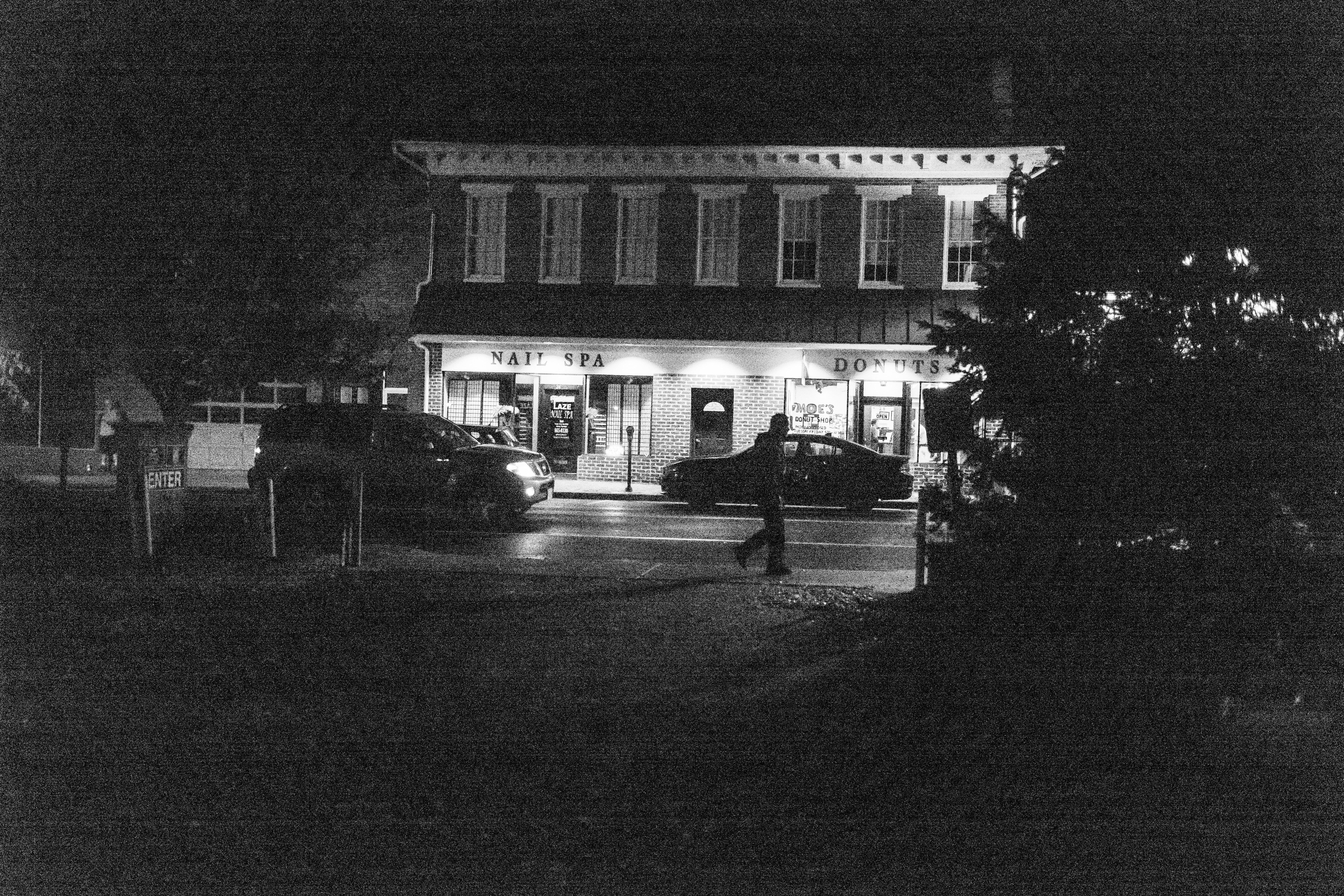 This photograph captures a quiet night scene with a nail spa and donut shop illuminated against the dusk. The interplay of soft lighting and shadows creates a contemplative mood, while the lone figure walking by adds a sense of solitude and intrigue. The stark contrast between the darkness and light adds depth and draws the viewer's eye to the welcoming glow of the storefronts.