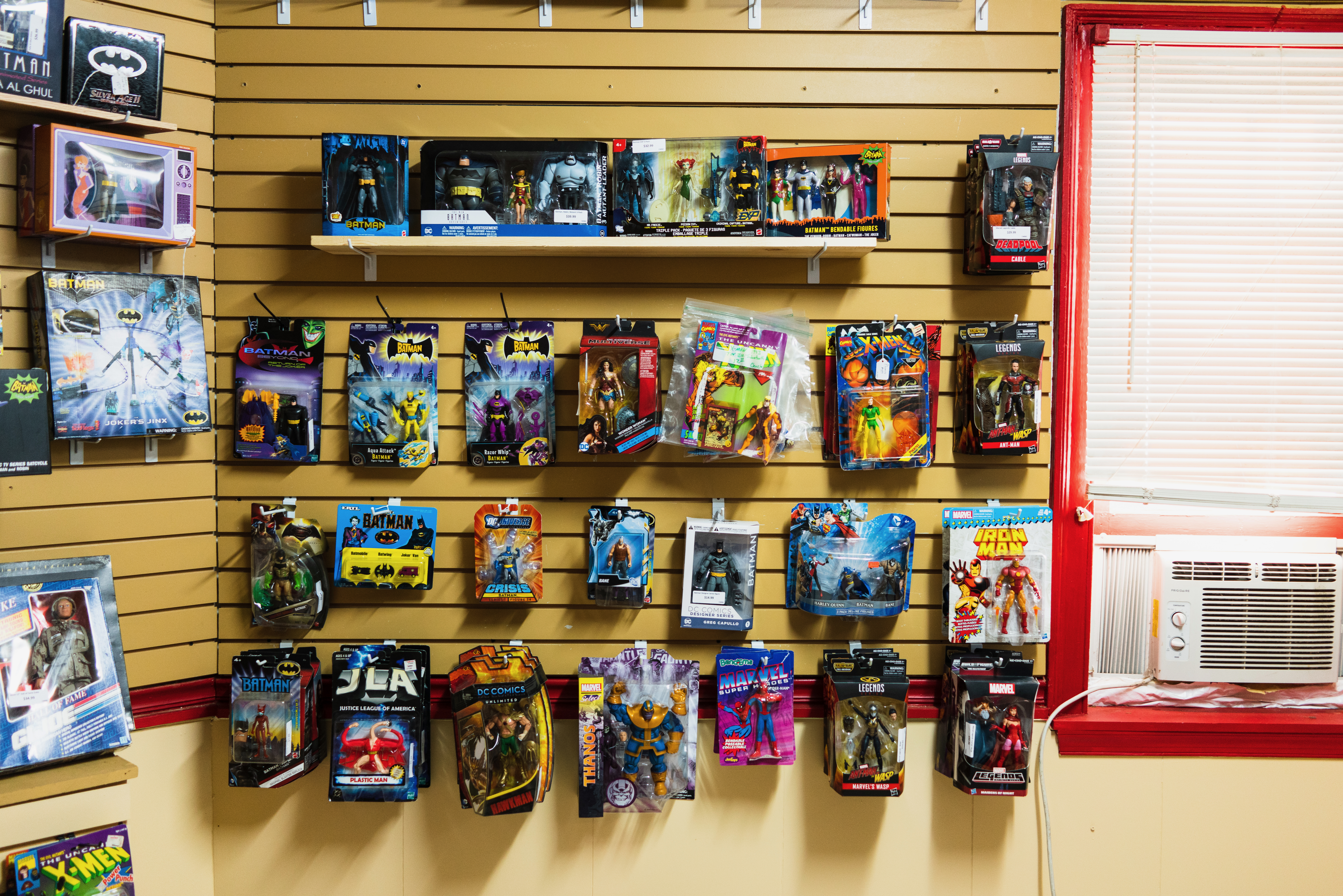 The photograph showcases a vibrant display of action figures mounted on slat walls, capturing a sense of nostalgia and childhood wonder. The warm lighting highlights the colorful packaging and varied characters, creating a cheerful atmosphere reminiscent of comic book shops. A small window peeks in light, accentuating the details while contrasting with the more vibrant hues of the toys.