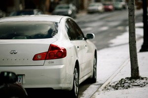 The photograph captures a sleek white Infiniti G35 parked on a snowy street, exuding a sense of calm in an urban setting. Soft, diffused lighting enhances the car's polished exterior, while the blurred background of muted colors and a snowy surface creates a tranquil atmosphere. The composition draws the eye to the vehicle, highlighting its elegance against the understated urban backdrop.
