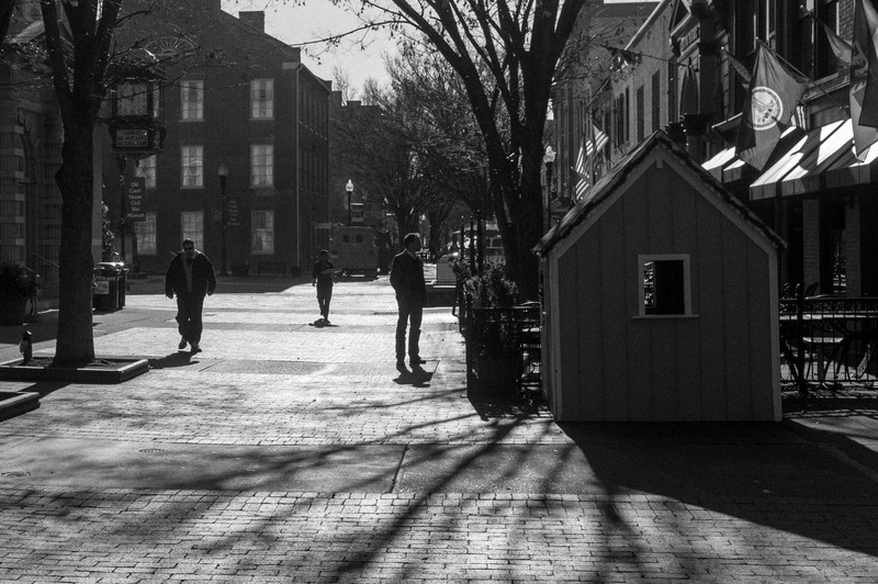 In a stark black-and-white composition, shadows stretch across the cobblestone street as solitary figures wander amidst the quiet, reflecting a mood of solitude and contemplation. The interplay of light and shadow creates an atmospheric depth, enhancing the sense of calm in the urban landscape. A quaint shed stands sentinel on the edge of the scene, framing the ghostly outlines of the trees and buildings in the background, inviting viewers to ponder the stories hidden within.