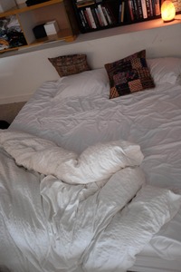 The photograph captures a cozy, unmade bed with rumpled white bedding, inviting a sense of calm and comfort. Soft lighting from a nearby lamp casts a warm glow, enhancing the serene mood. Textured throw pillows add a touch of personality against the minimalist backdrop of a tidy room, creating a peaceful retreat from the outside world.