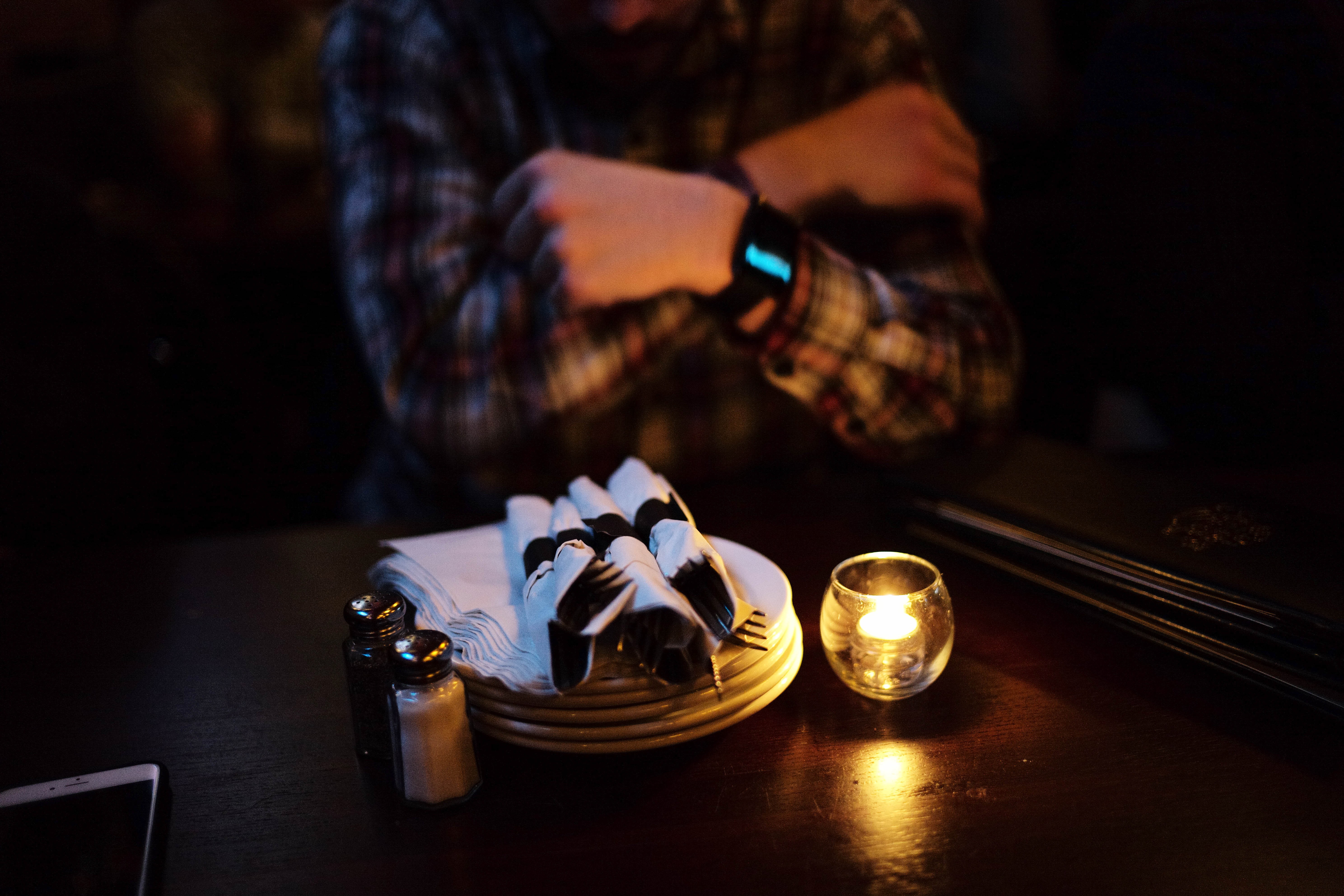 In this dimly lit restaurant scene, a lone figure sits with crossed arms, their attention drawn to a plate of neatly arranged napkins and a flickering candle. The warm, soft glow of the candlelight sets a cozy yet contemplative mood, inviting a sense of quiet reflection amidst the bustling background. Shadows play across the table, creating a contrast that emphasizes the simple elegance of the setting.