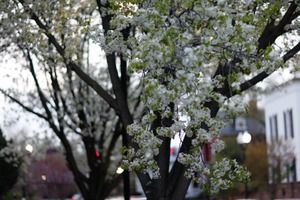 A close-up of blooming white flowers against a backdrop of dark, shadowy trees evokes a serene yet fleeting moment in spring. The soft, diffused light enhances the delicate petals while the blurred background suggests a peaceful suburban setting. This composition captures the beauty of nature awakening, instilling a sense of tranquility and nostalgia.