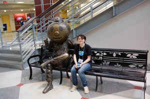 A young woman sits comfortably beside a whimsical bronze statue, both wearing relaxed expressions. The bright, airy environment is enhanced by natural lighting that emphasizes the playful mood of the scene. This composition captures a light-hearted moment, blending the animated character with the presence of a real person in a casual setting.