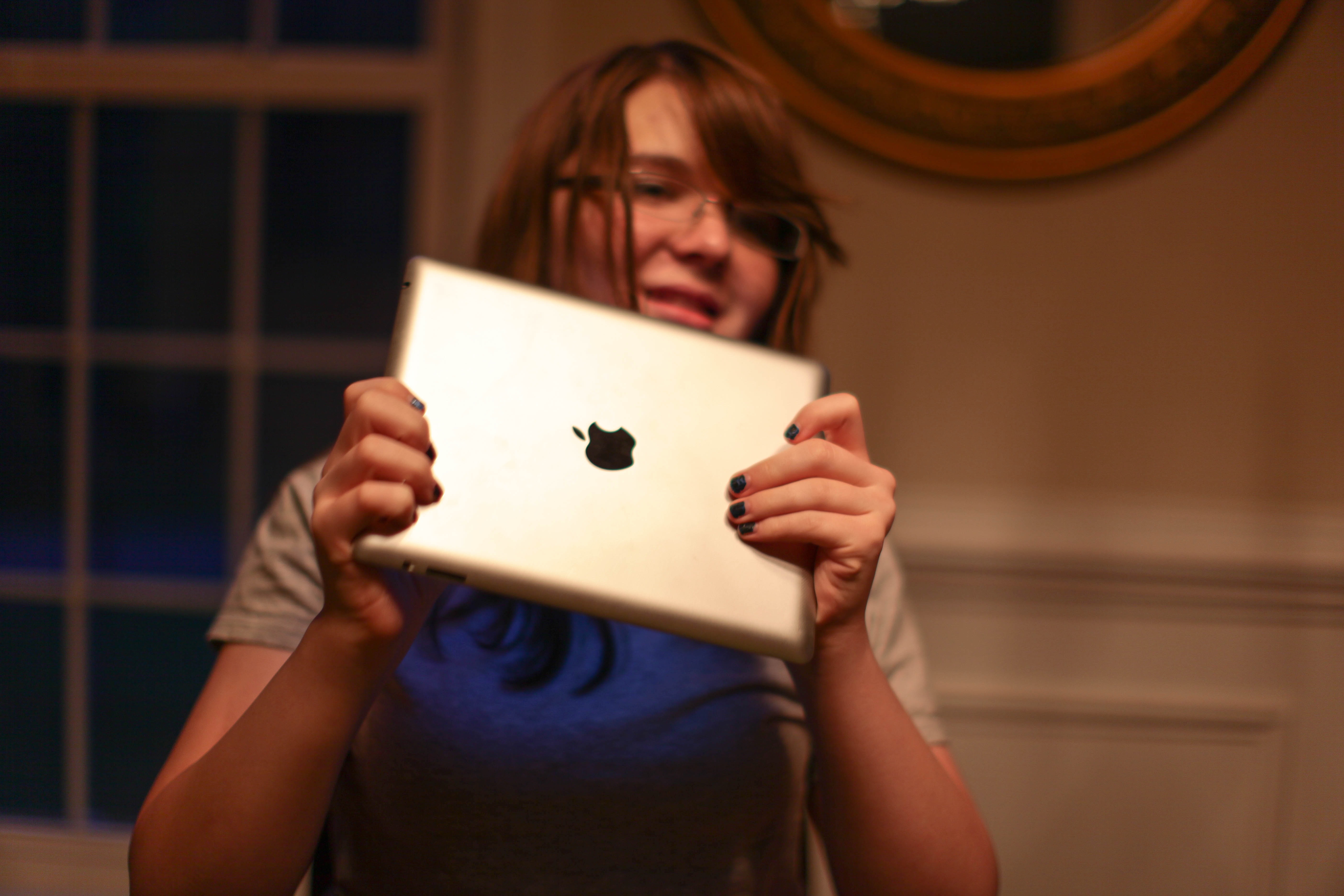 A girl holds an iPad in front of her, her face partially lit with a warm, soft glow. The composition centers on her engaging expression, suggesting excitement or curiosity, while the blurred background adds an intimate, cozy atmosphere. Subtle shadows and highlights enhance the mood, making it feel like a candid moment of connection with technology.