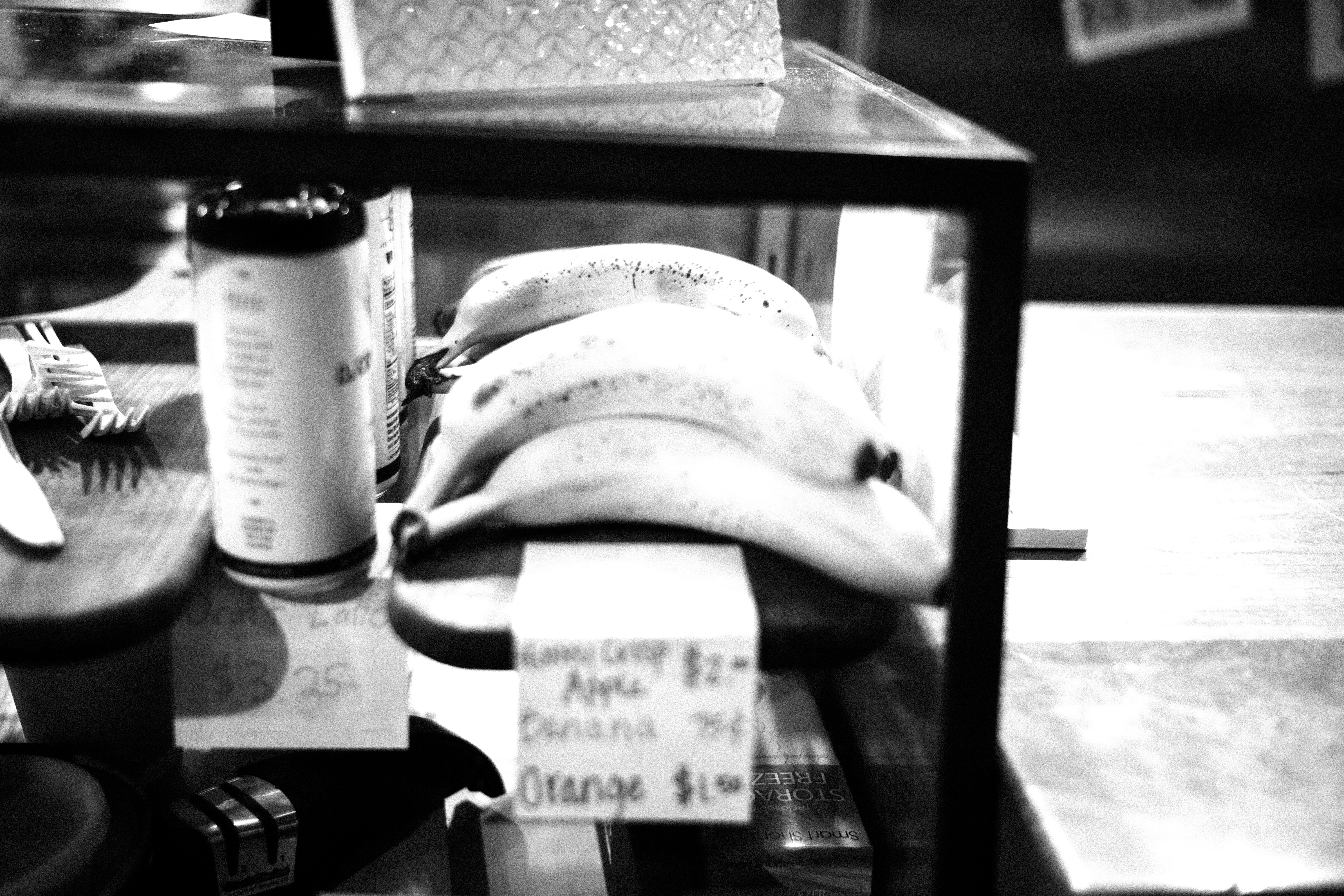 A monochrome photograph captures a sleek display of bananas nestled behind a glass case, their speckled skins contrasting against the stark light. Handwritten price tags provide a rustic charm, grounding the image in a casual market atmosphere. The subtle play of shadows and soft lighting enhances the inviting yet uncomplicated mood, inviting viewers to ponder the simplicity of everyday choices.