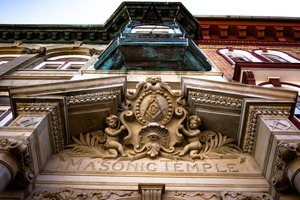 This photograph captures the intricate details of the Masonic Temple's façade, viewed from a low angle that emphasizes its grandeur. The warm sunlight bathes the stone carvings, enhancing the ornate textures and shadows, while the vibrant colors of the surrounding architecture add depth to the scene. The mood is both historic and contemplative, inviting viewers to ponder the stories behind the building's rich symbolism and craftsmanship.