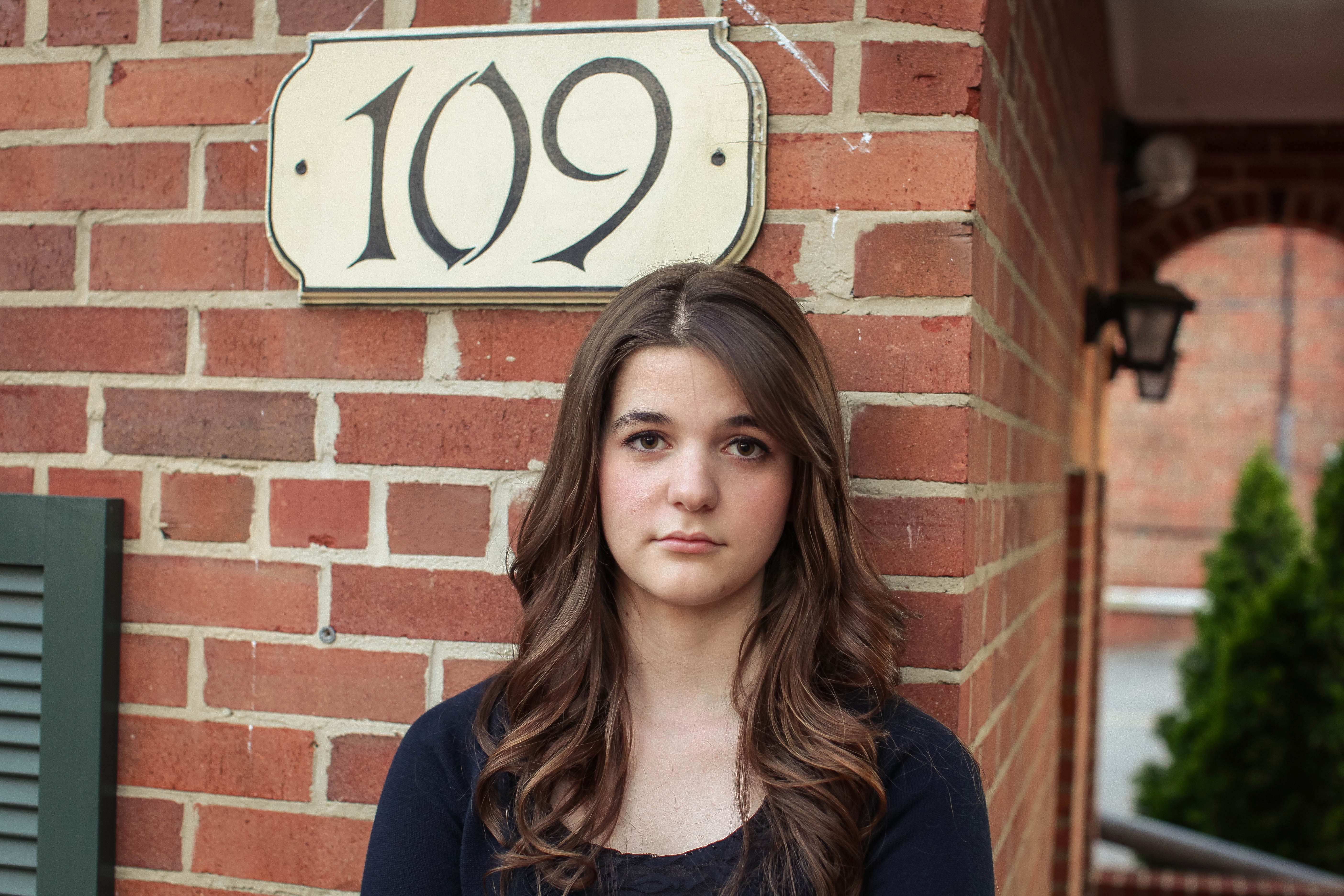 A young woman stands in front of a textured brick wall, marked by the number 109. Her expression is introspective and serious, with soft natural light accentuating her features and creating a subtle contrast with the warm tones of the bricks. The composition draws attention to her solemn demeanor, evoking a sense of quiet reflection amidst an ordinary backdrop.