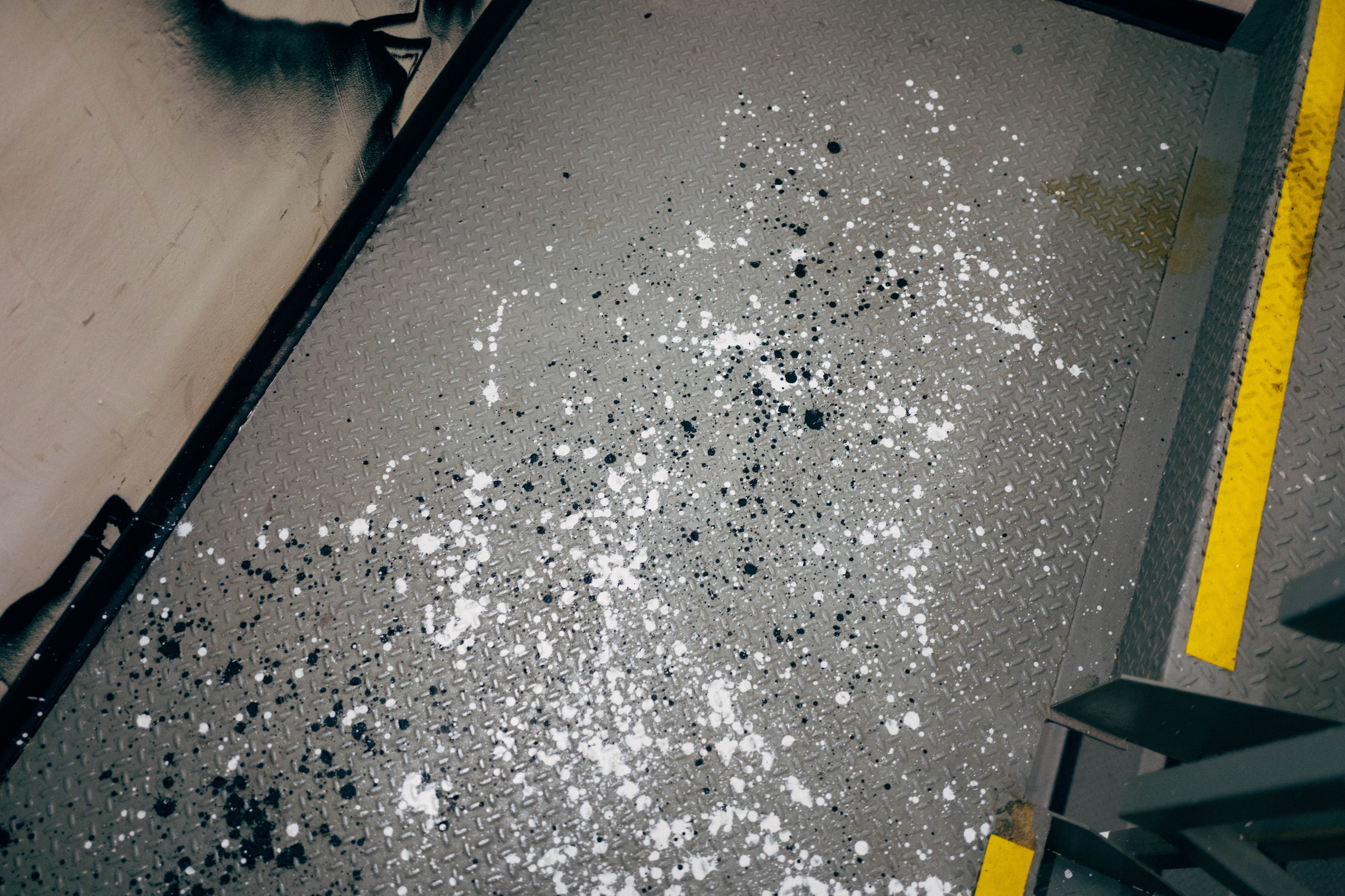 A view of a staircase from above reveals a chaotic scattering of black and white splatters on the metal surface. The stark contrast and irregular patterns create a sense of dynamic movement, while the soft natural light casts gentle shadows, enhancing the textures beneath. This captures a moment of artistic disarray, suggesting stories of creativity and abandonment.