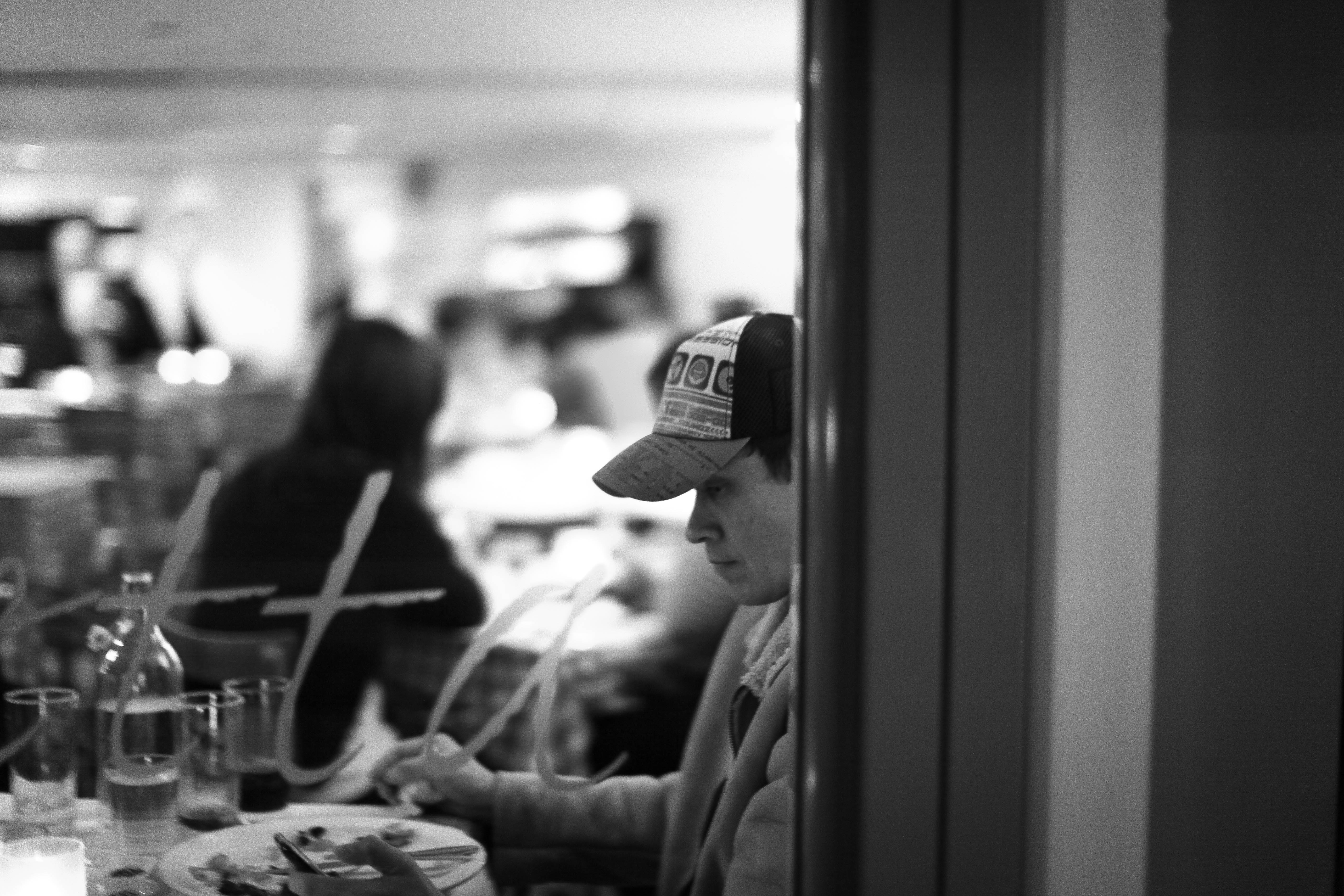 The photograph captures a lone figure seated at a table, partially obscured by a glass barrier, creating a sense of introspection. The blurred background, filled with warm candlelight and fellow diners, contrasts the figure's focused demeanor, suggesting a moment of solitude amid the bustling atmosphere of the restaurant. The monochromatic tones enhance the mood, evoking a contemplative and serene ambiance.