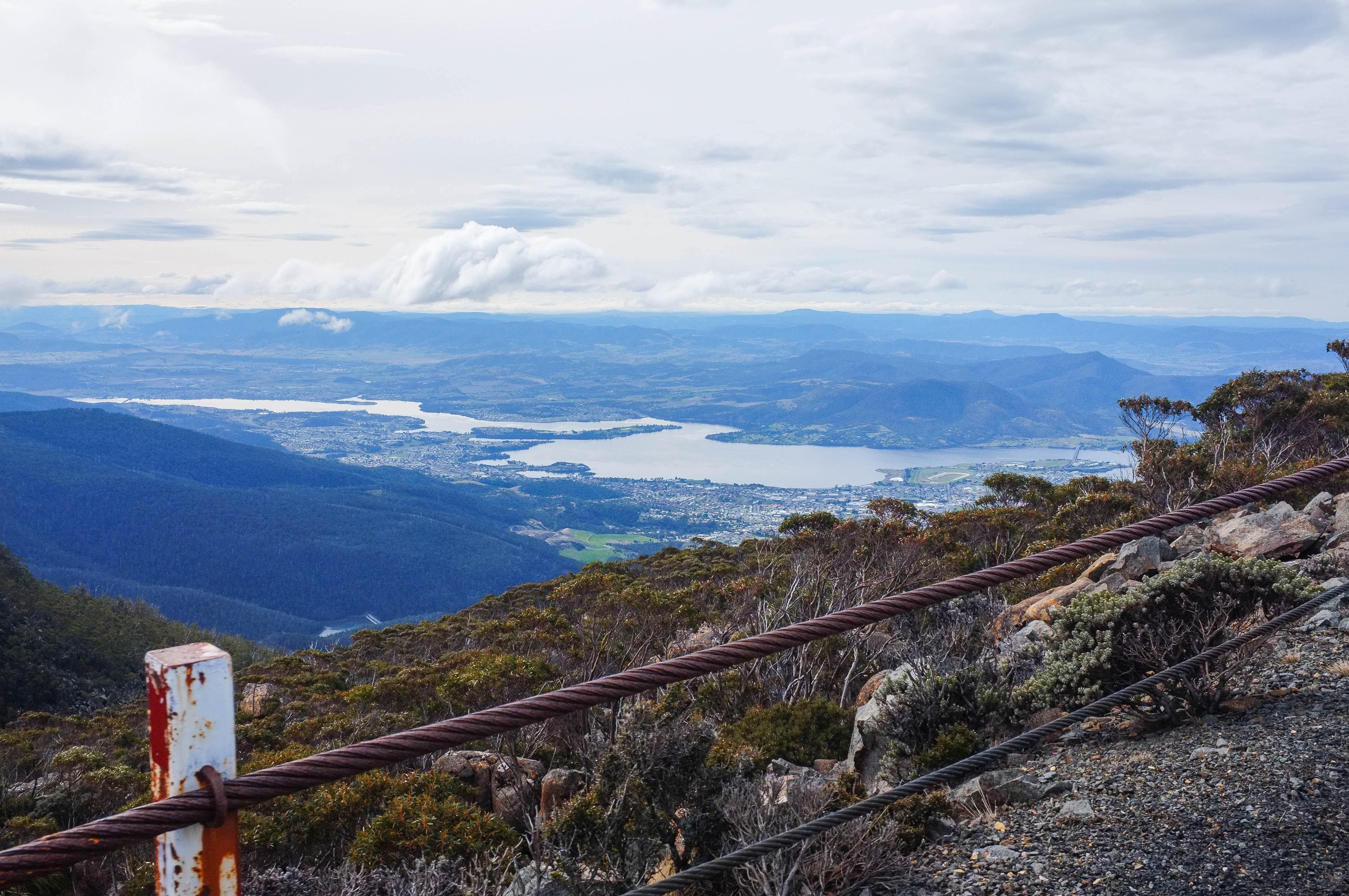 This photograph captures a breathtaking view from a mountain summit, where sweeping hills meet a tranquil bay. The landscape is dotted with lush greenery and framed by a sturdy wire fence that suggests both protection and adventure. Soft, overcast lighting enhances the serene atmosphere, evoking a sense of peace amidst the vastness of nature.