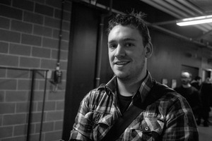 In a dimly lit corridor, a young man with a friendly smile stands out against the shadowy background, wearing a checkered shirt and a messenger bag. The soft lighting emphasizes his expression, evoking a sense of warmth and approachability in an otherwise stark environment. The composition captures a fleeting moment, suggesting stories and interactions just beyond the frame.