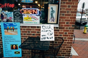 A cozy café corner adorned with vibrant signage and an expressive message on a board that reads, 'OUR children are watching.' The atmosphere is a mix of warmth from the neon lights and a reflective urgency evoked by the handwritten sign. The subdued daylight, coupled with the rich textures of brick and metal, draws attention to the contrast between the inviting café and the serious reminder displayed outside.