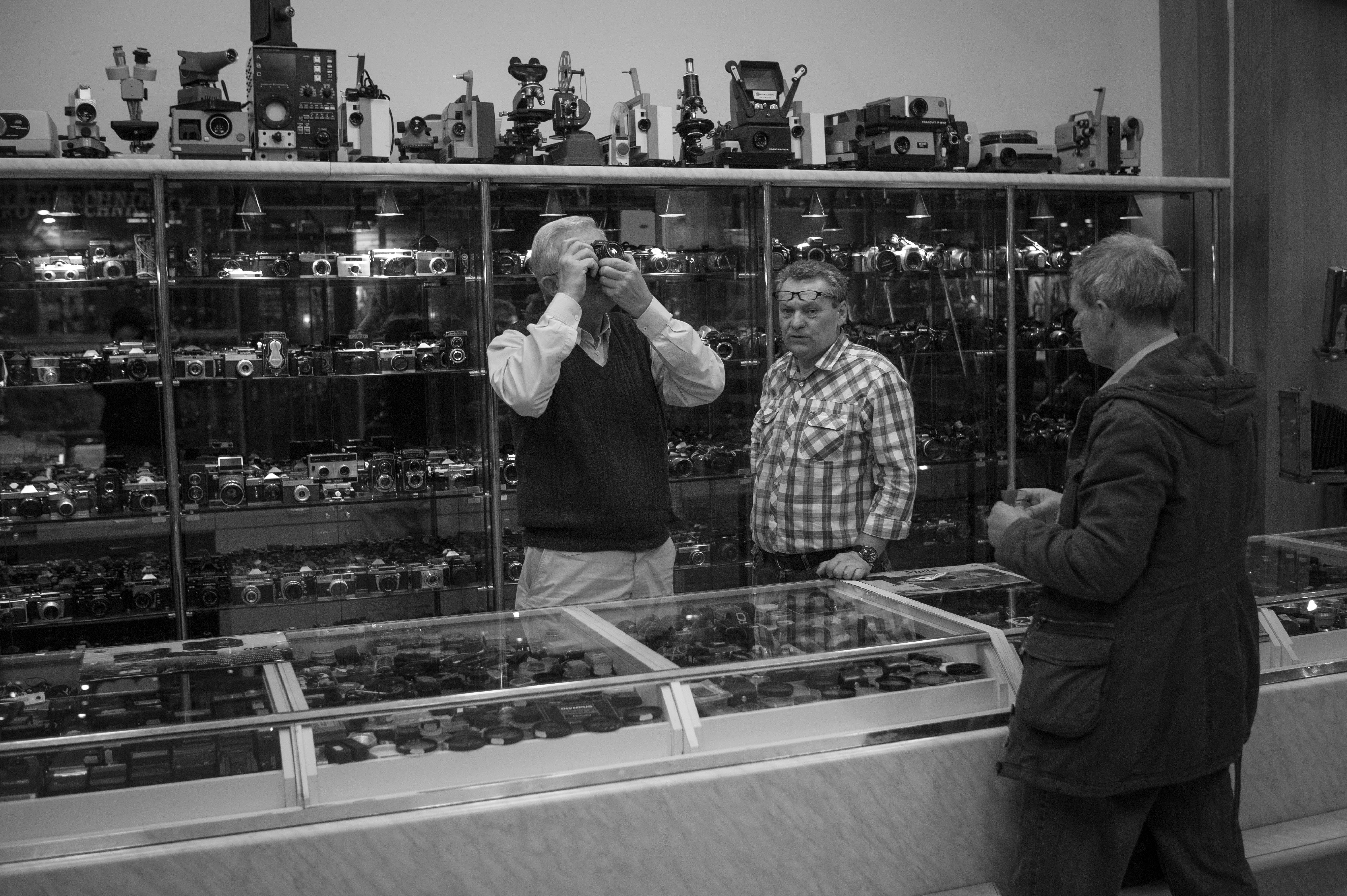 In this black-and-white photograph, three men are captured in a vintage camera shop, their expressions reflecting curiosity and nostalgia. The interplay of light and shadow accentuates the myriad cameras behind them, creating a sense of depth and history. The composition effectively draws the viewer’s eye toward the intricate details of both the cameras and the men’s interactions, evoking a mood of shared passion for photography.