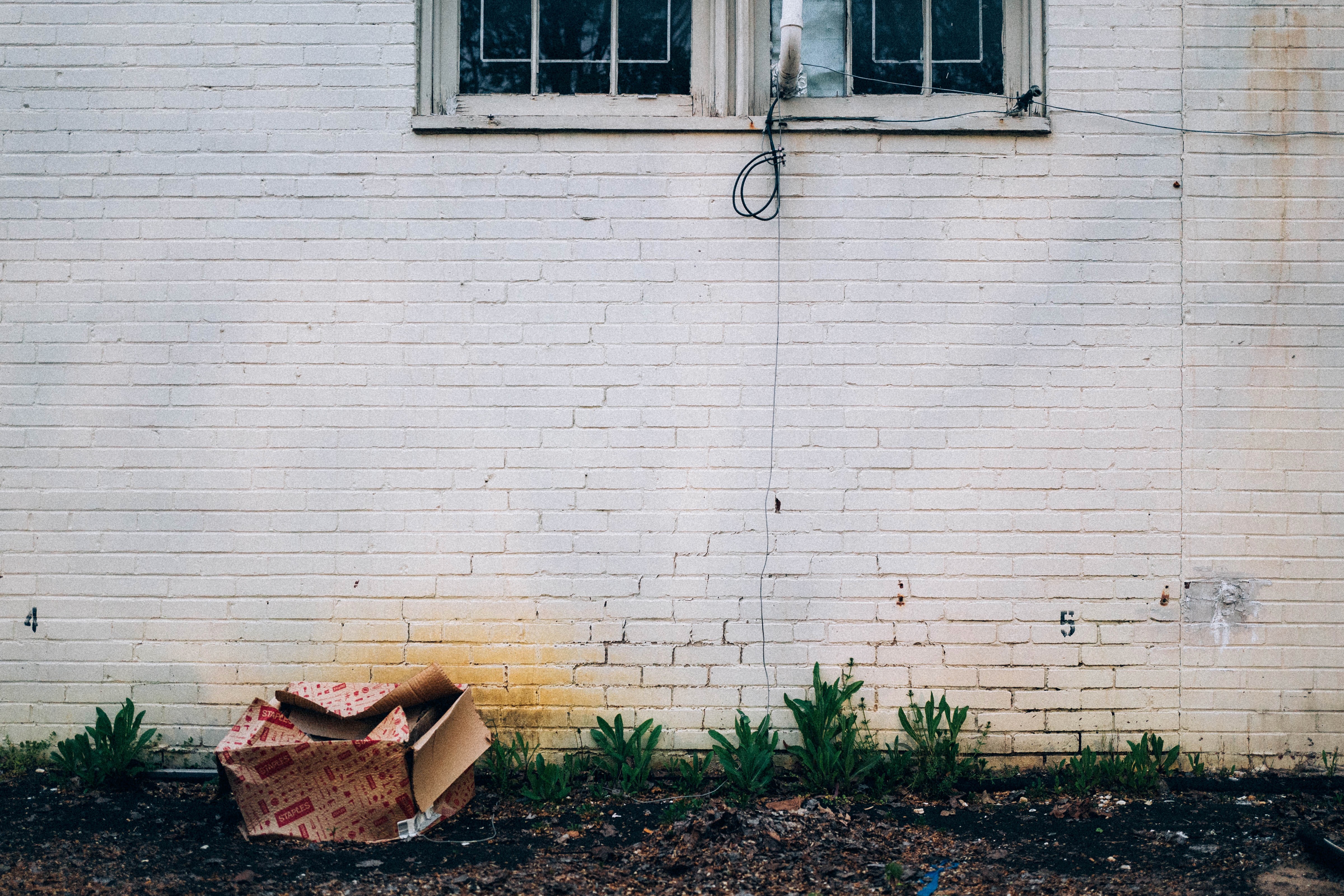 The photograph captures a stark, urban landscape featuring a weathered white brick wall and a discarded cardboard box nestled at its base. The muted lighting casts a somber mood, as the box and sparse greenery draw attention to themes of neglect and isolation. The composition's simplicity emphasizes the contrast between the manmade and the natural, evoking a sense of quiet reflection.