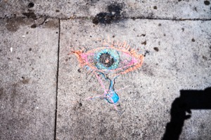 This photograph features a vibrant chalk drawing of an eye on a concrete surface, emphasizing the contrast between the colorful artwork and the dull gray pavement. The composition is slightly off-center, creating an intriguing focal point that captures the viewer’s attention. Sunlight casts a bright, inviting glow over the drawing, adding to the playful yet contemplative mood of the scene.