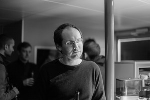 In a dimly lit room, a man stands slightly in profile, lost in thought as he observes a gathering behind him. The monochrome tones enhance the mood of introspection, capturing a blend of curiosity and contemplation amidst a lively backdrop. Soft lighting subtly highlights his features, creating a striking contrast against the blurred figures around him, reinforcing his sense of isolation in the midst of social interaction.