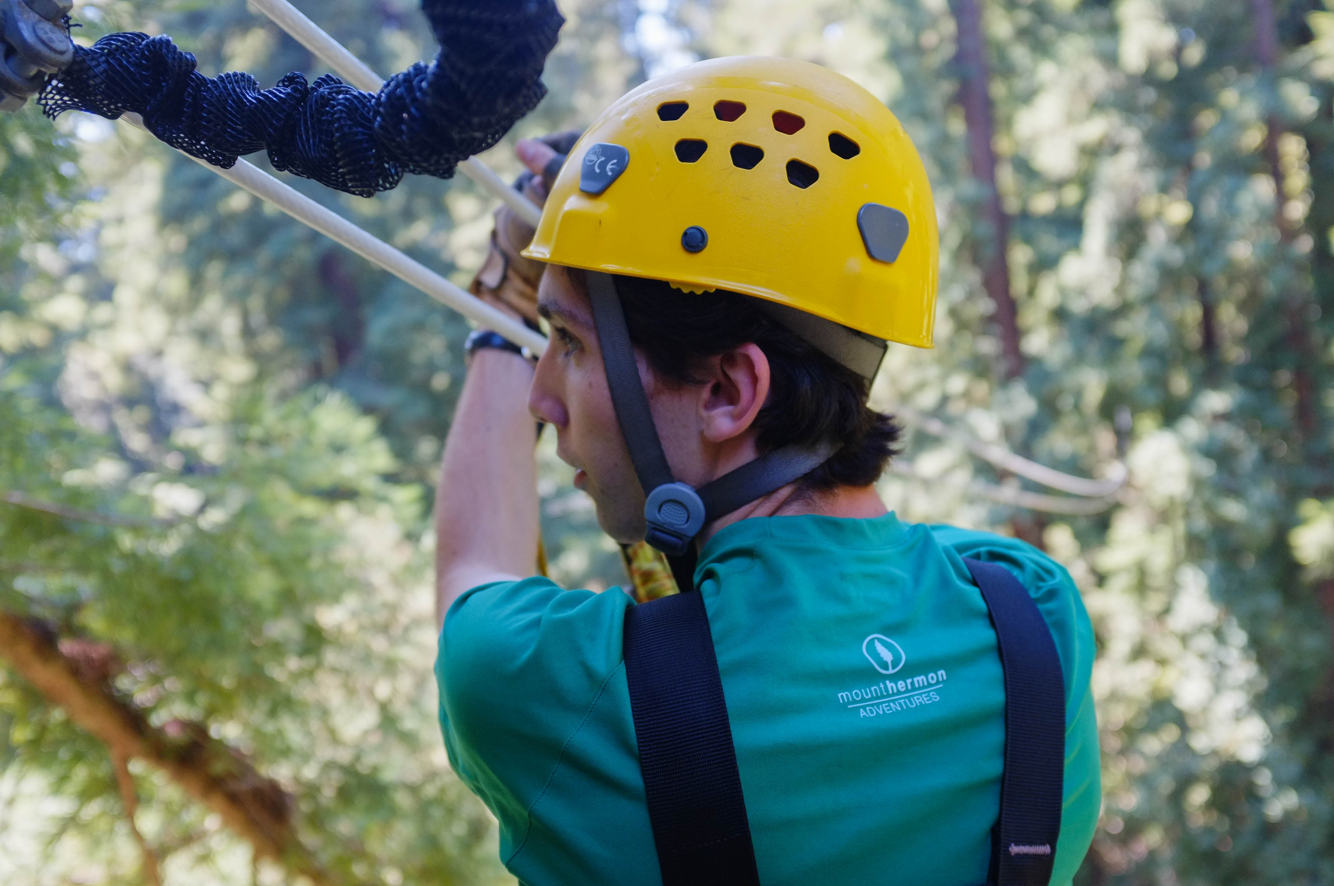 A young man in a vivid green shirt and yellow helmet prepares for an exhilarating zip line adventure, his focus intense and palpable. The sunlight filters through the dense trees, casting a warm glow that highlights the anticipation in his posture. This moment captures the blend of thrill and serenity that comes with outdoor exploration.