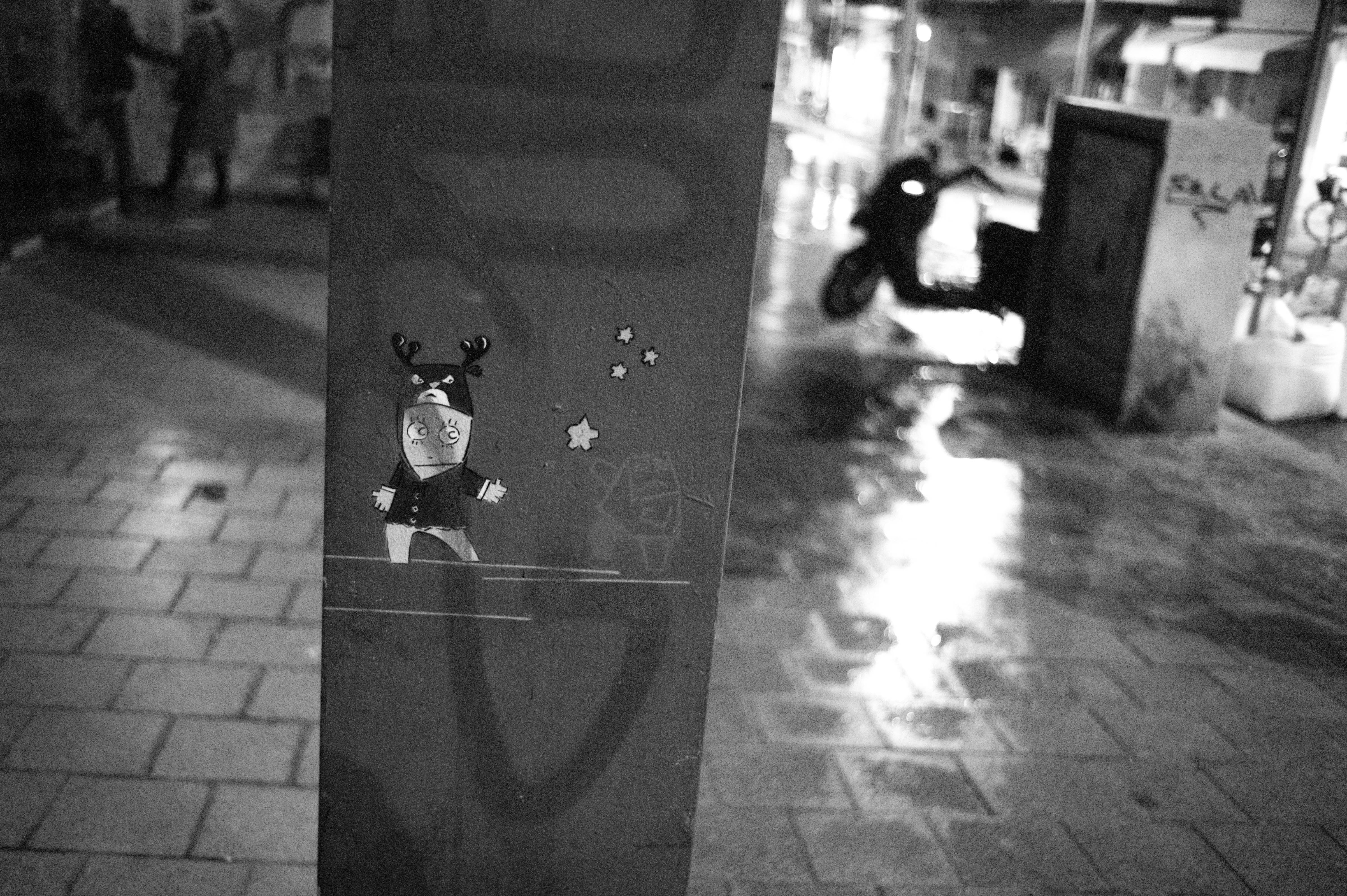 A playful sticker of a character with antlers clings to a pole in a dimly lit alleyway, adding a whimsical charm to the urban landscape. The wet pavement reflects the scattered lights, creating a moody atmosphere that contrasts with the bright cartoonish image. This striking juxtaposition invites viewers to explore the layers of the city beneath the surface.