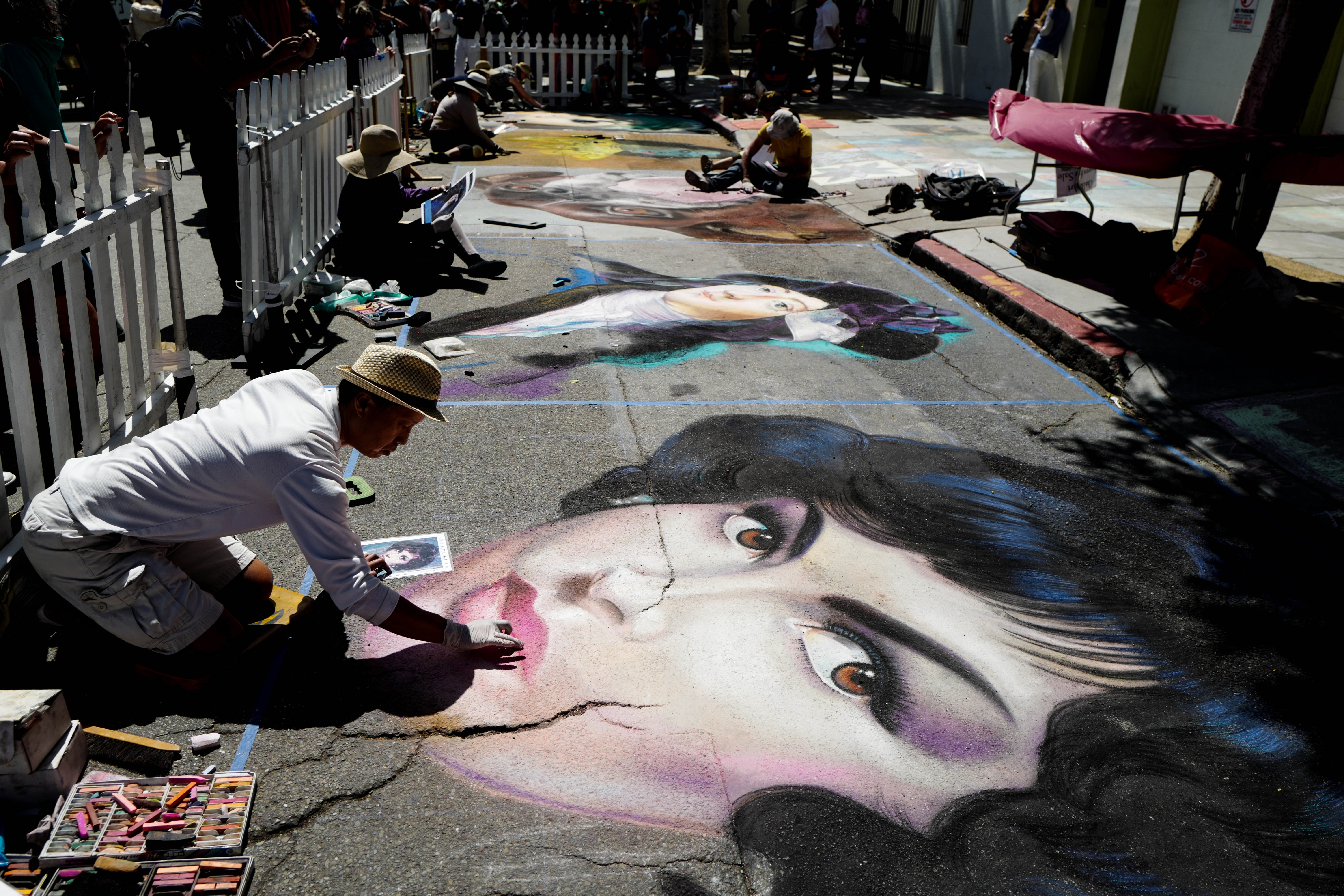 In a vibrant street scene, artists concentrate on creating large, colorful chalk portraits on the pavement, showcasing their creativity and skill. The bright sunlight casts lively shadows, enhancing the vivid colors and details of the artwork. A sense of community and inspiration is palpable as onlookers admire the intricate designs that transform an ordinary sidewalk into a canvas of artistry.