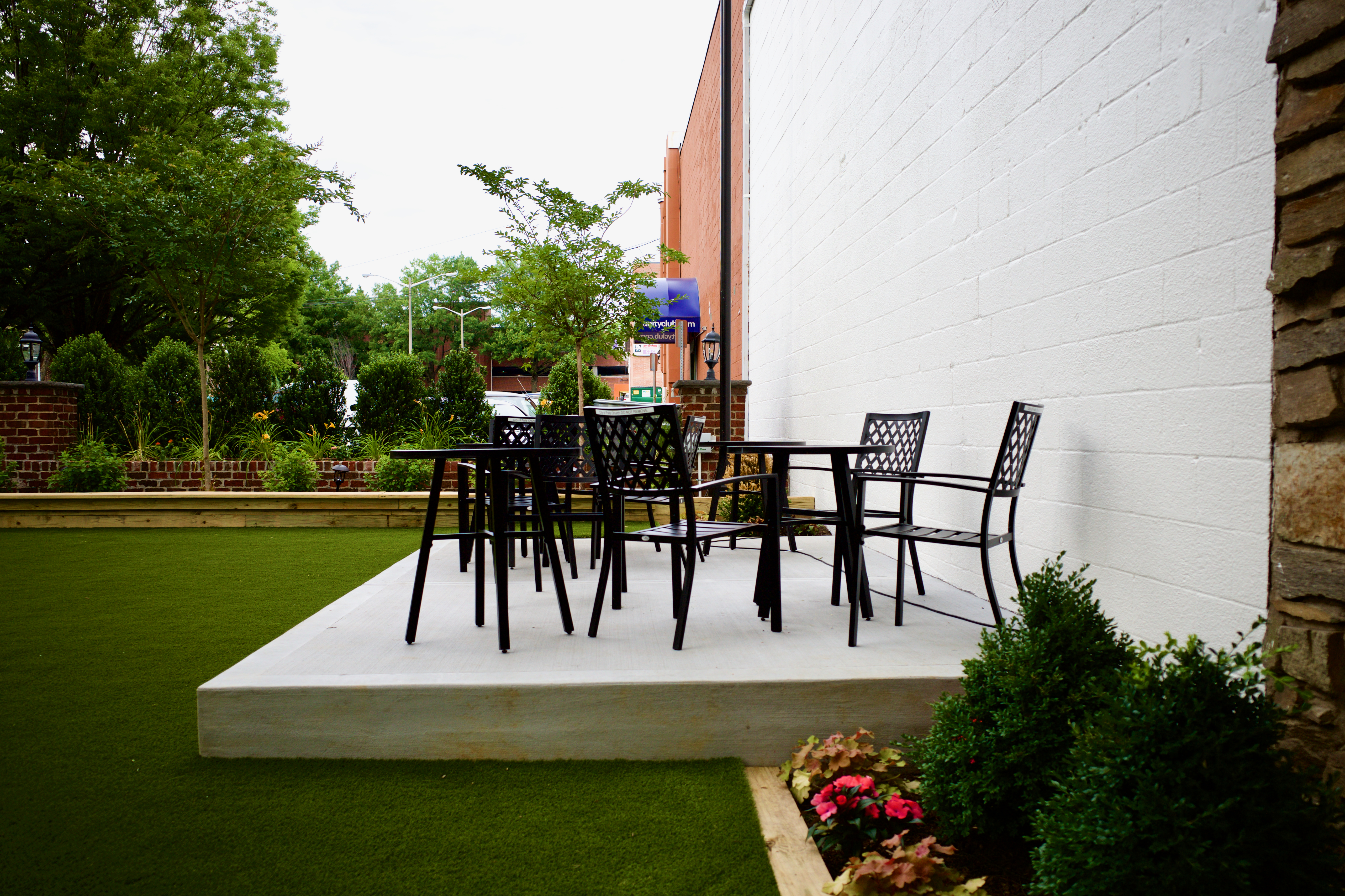 This photograph captures a serene outdoor seating area, featuring sleek, modern tables and chairs arranged neatly on a raised platform. The soft, natural lighting suggests a tranquil atmosphere, enhanced by the lush greenery surrounding the space. The composition invites contemplation, making it an ideal spot for relaxation or casual conversation amid nature and urban surroundings.