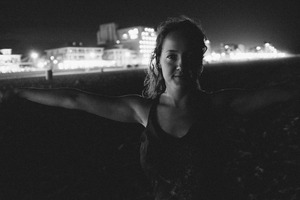 A silhouetted figure stands against a softly lit backdrop of a beachfront, arms outstretched as if inviting the night. The monochrome tones enhance the mood, creating a sense of freedom and tranquility. The luminous buildings in the distance contrast with the dark foreground, adding depth and a dreamy quality to the scene.