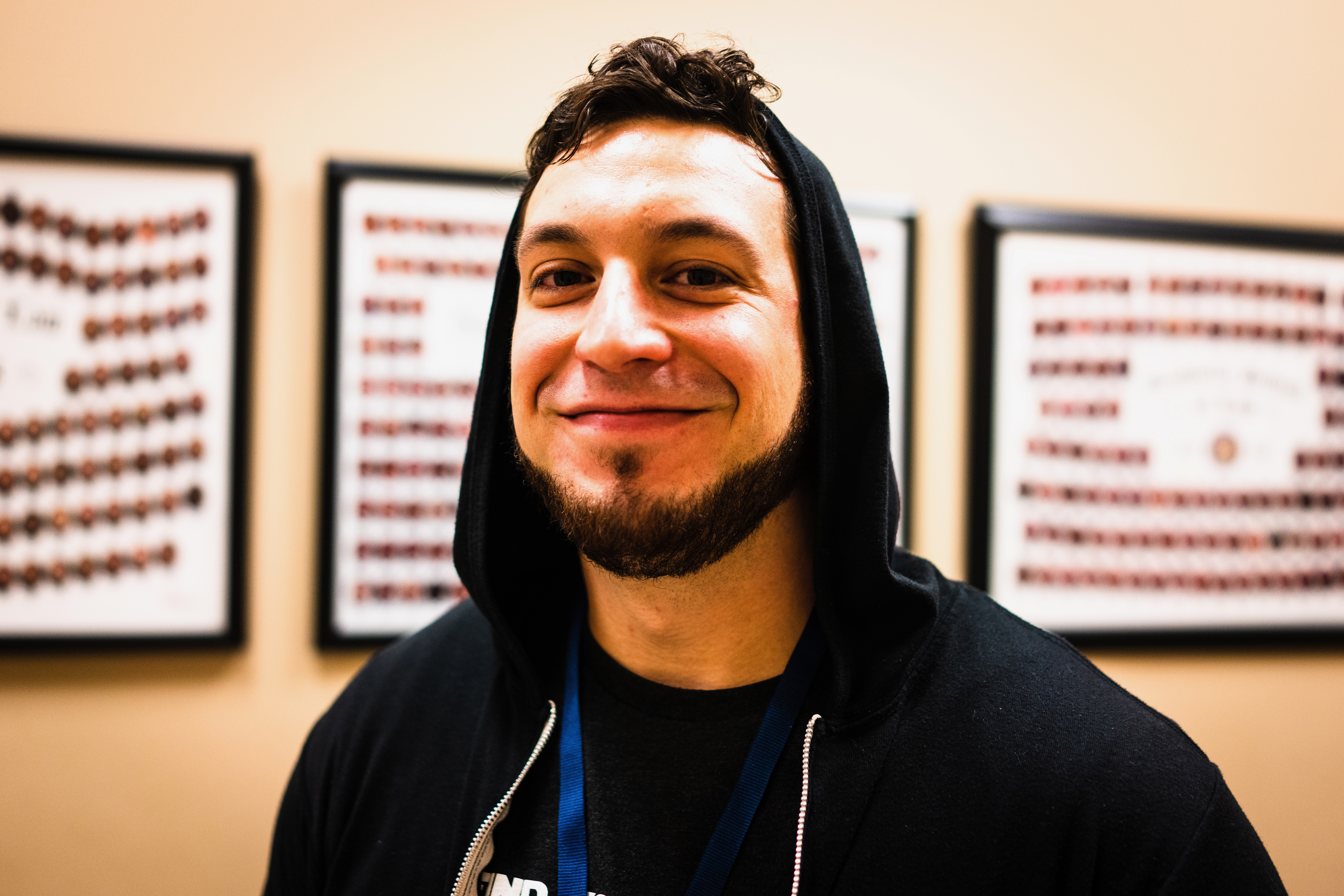 The portrait captures a man in a black hoodie, exuding warmth and approachability with a genuine smile. Soft lighting emphasizes his facial features against the subtly distracting backdrop of framed photographs, creating a balanced yet intimate composition.