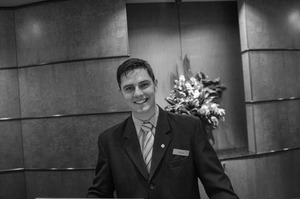 In this black and white photograph, a smiling man in a professional suit stands confidently at a reception desk. The warm lighting enhances his inviting demeanor, while the elegant background hints at a sophisticated setting, underscoring a mood of hospitality and professionalism.