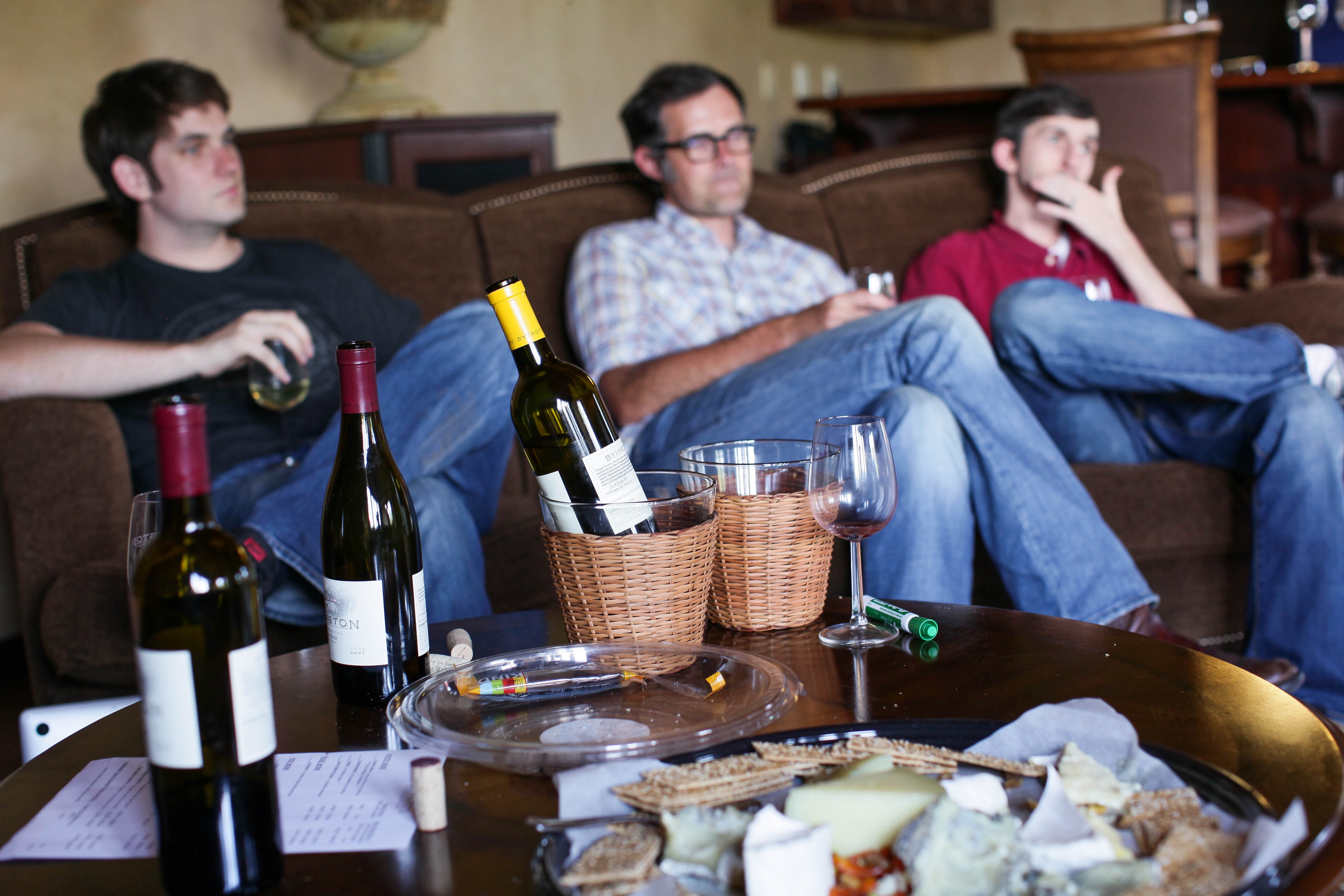 Three friends sit leisurely on a plush couch, immersed in conversation while surrounded by remnants of a wine tasting. The warm ambient lighting casts a relaxed mood, highlighting the array of wine bottles and an inviting spread of snacks laid out on the coffee table. Their contemplative expressions suggest a moment of camaraderie and reflection, echoing the laid-back atmosphere of the setting.