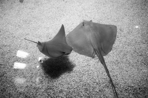 Two rays glide effortlessly over a sandy seabed, their elegant forms captured in striking black and white. The soft contrast and diffuse lighting create a tranquil atmosphere, enhancing the fluid motion of the creatures as they navigate their underwater world. The composition draws the eye to the harmonious interaction between the two rays, evoking a serene sense of harmony in nature.